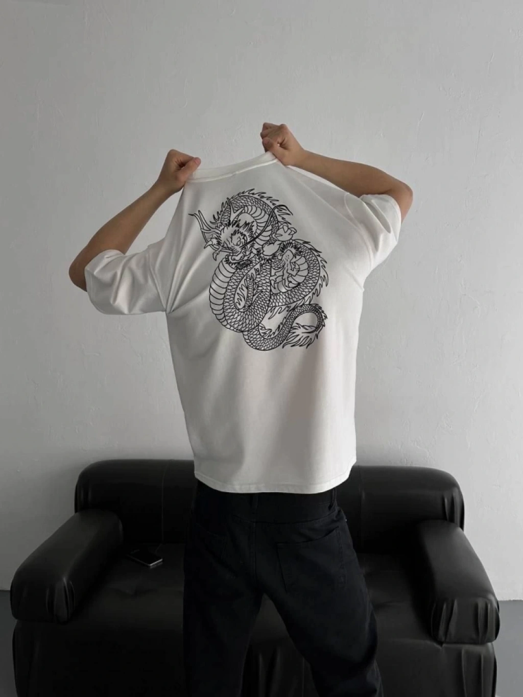 Erkek Melek Baskılı Oversize T-shirt - Siyah