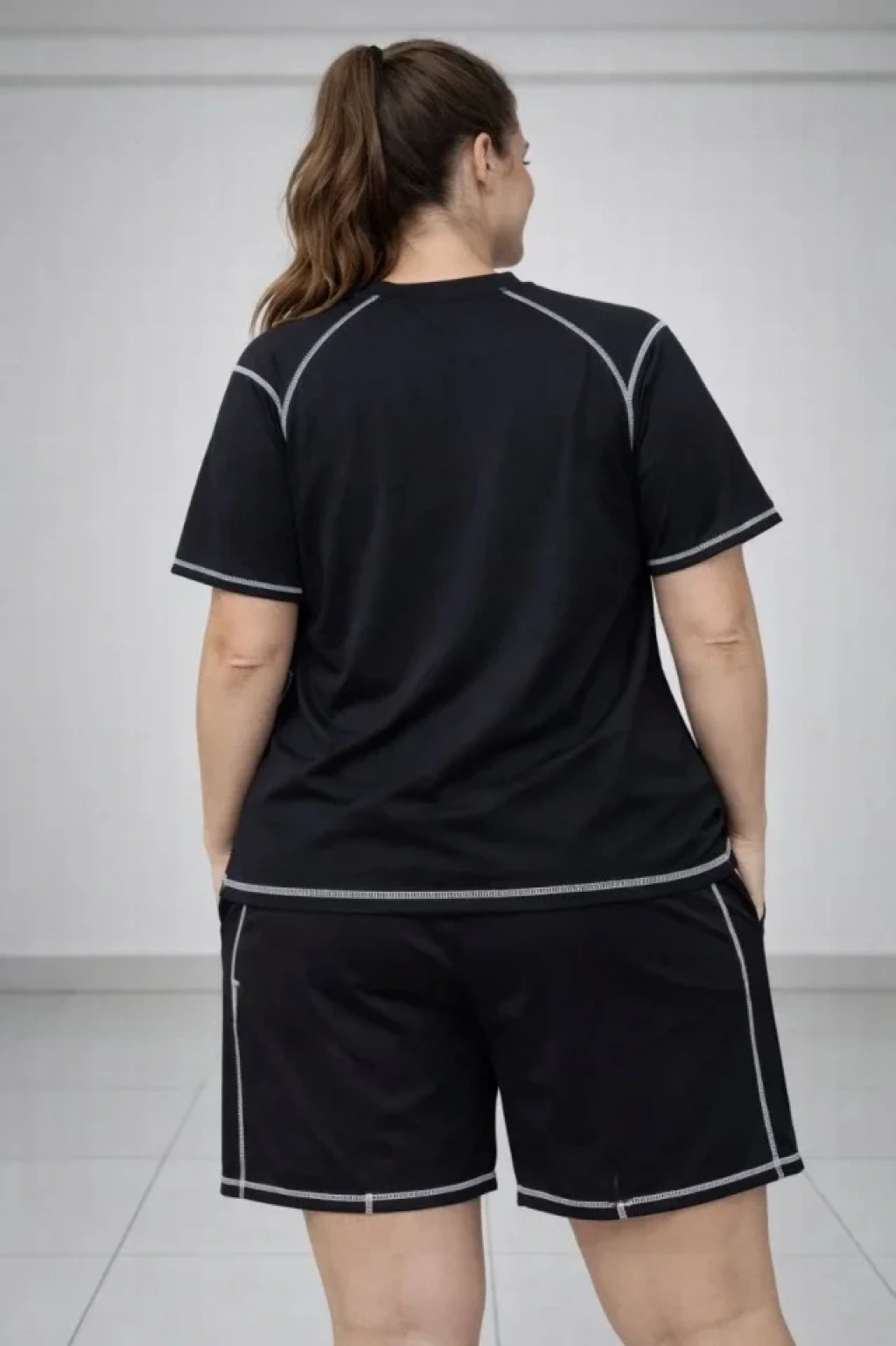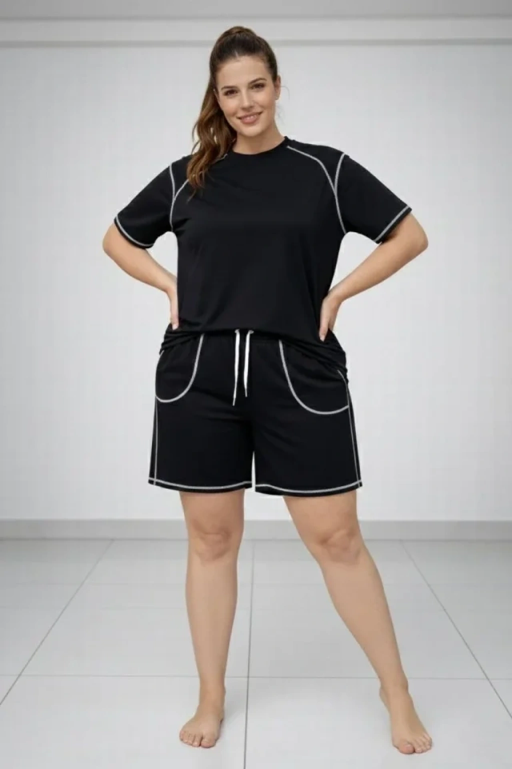 Battal Beden Kısa Kollu Tişört Şort Takım Kontrast Dikiş Detaylı Günlük Ev Giyimi - Siyah