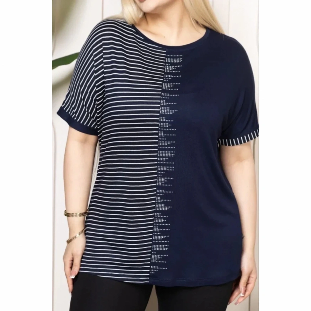 Büyük Beden Taş Detaylı Çizgili Viskon Tişört Bisiklet Yaka Rahat Kesim - Lacivert