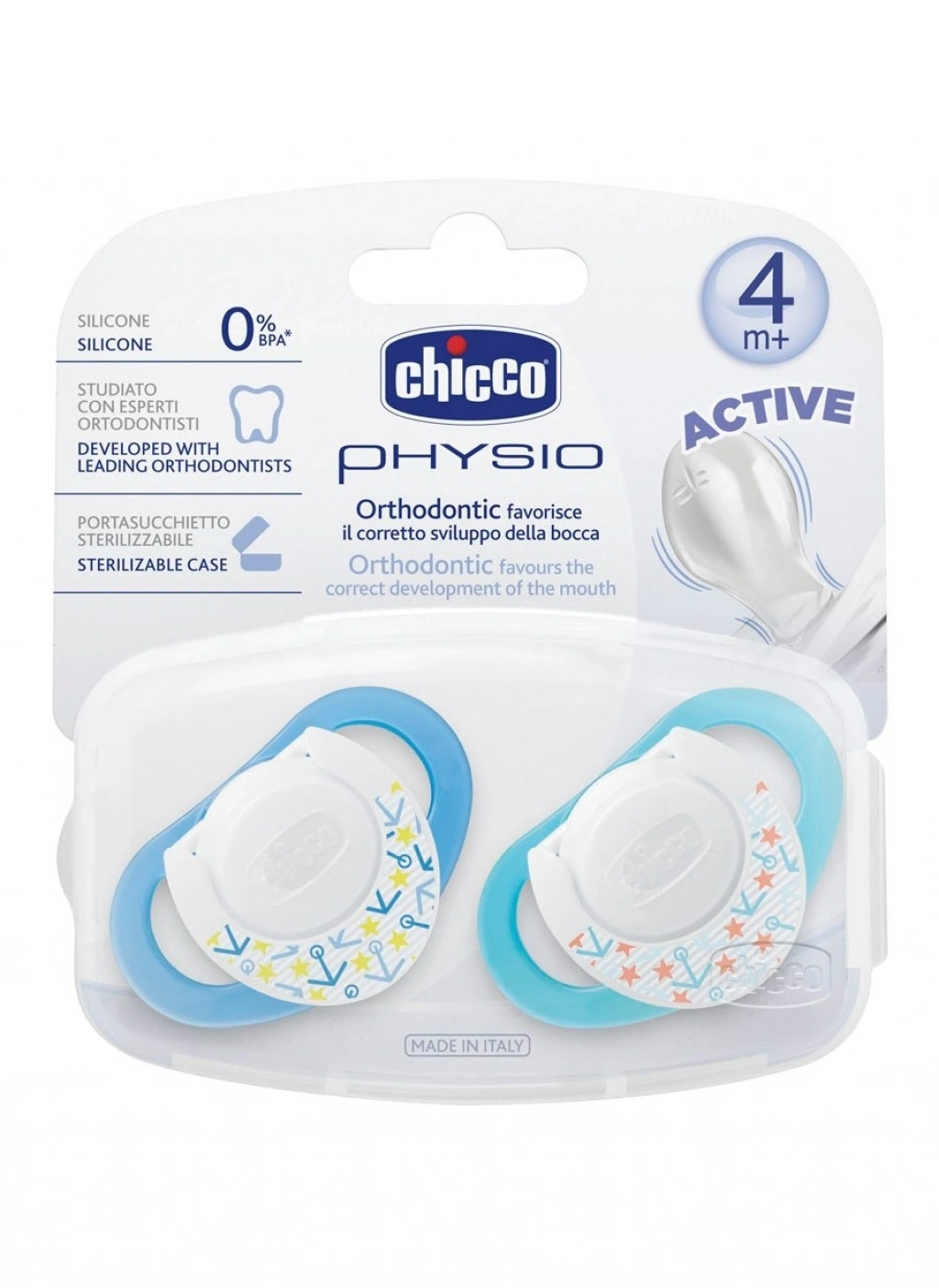 • Chicco bebeğinizin gülümsemesine özen gösterir, bu nedenle Chicco bebeğinizin ağzının doğru gelişimini aktif bir şekilde koruyan ortodontik ve aktif meme ucuna sahip emziği geliştirmiştir