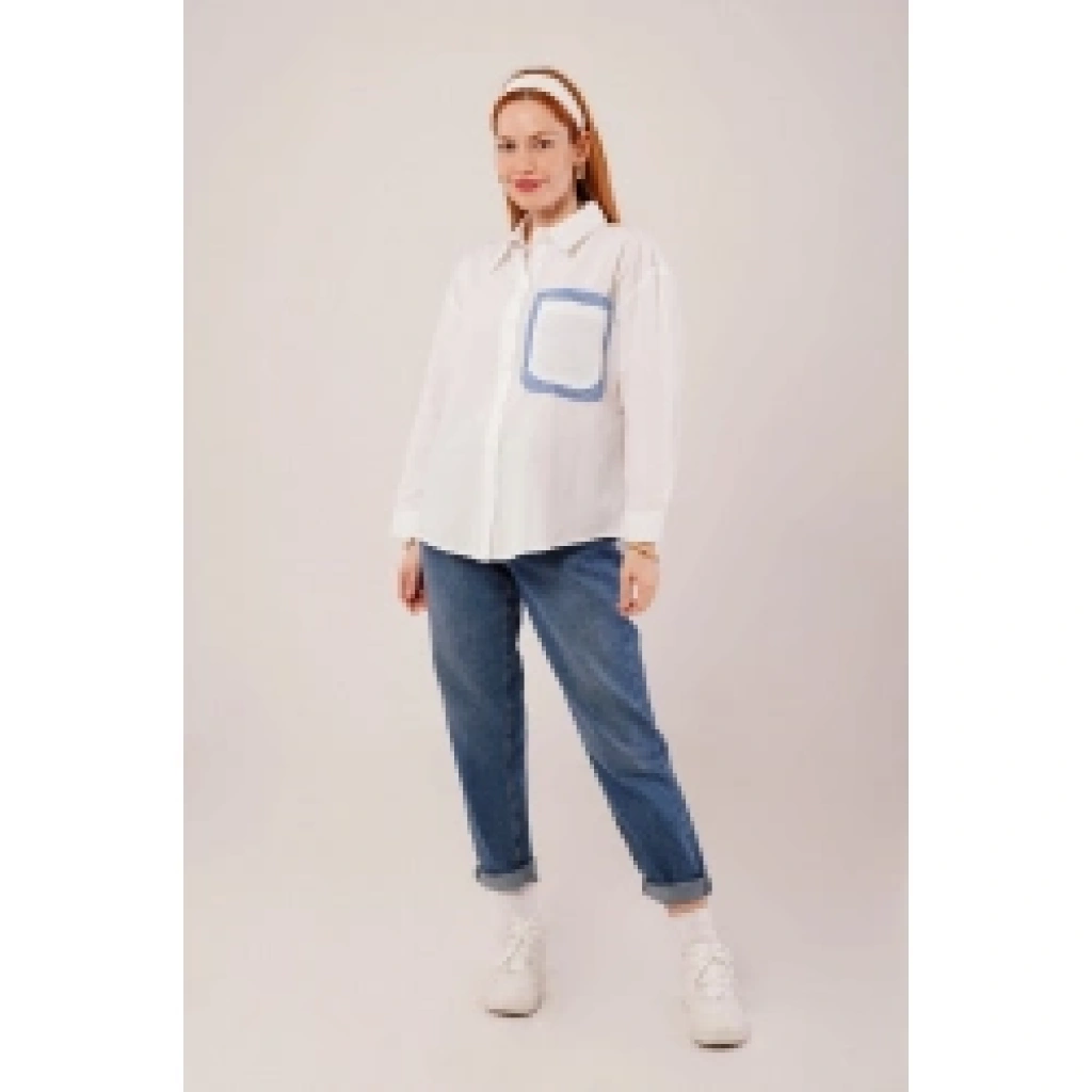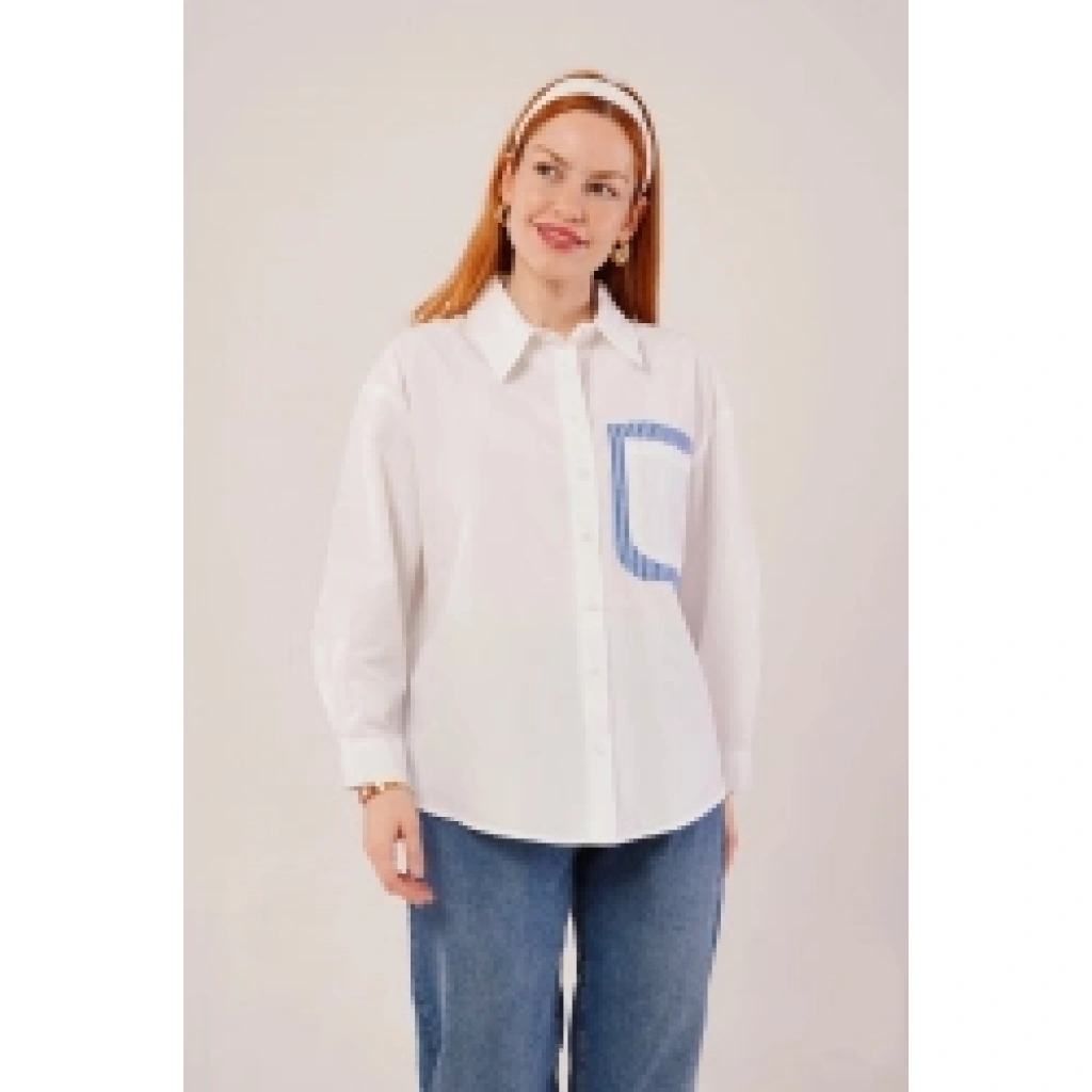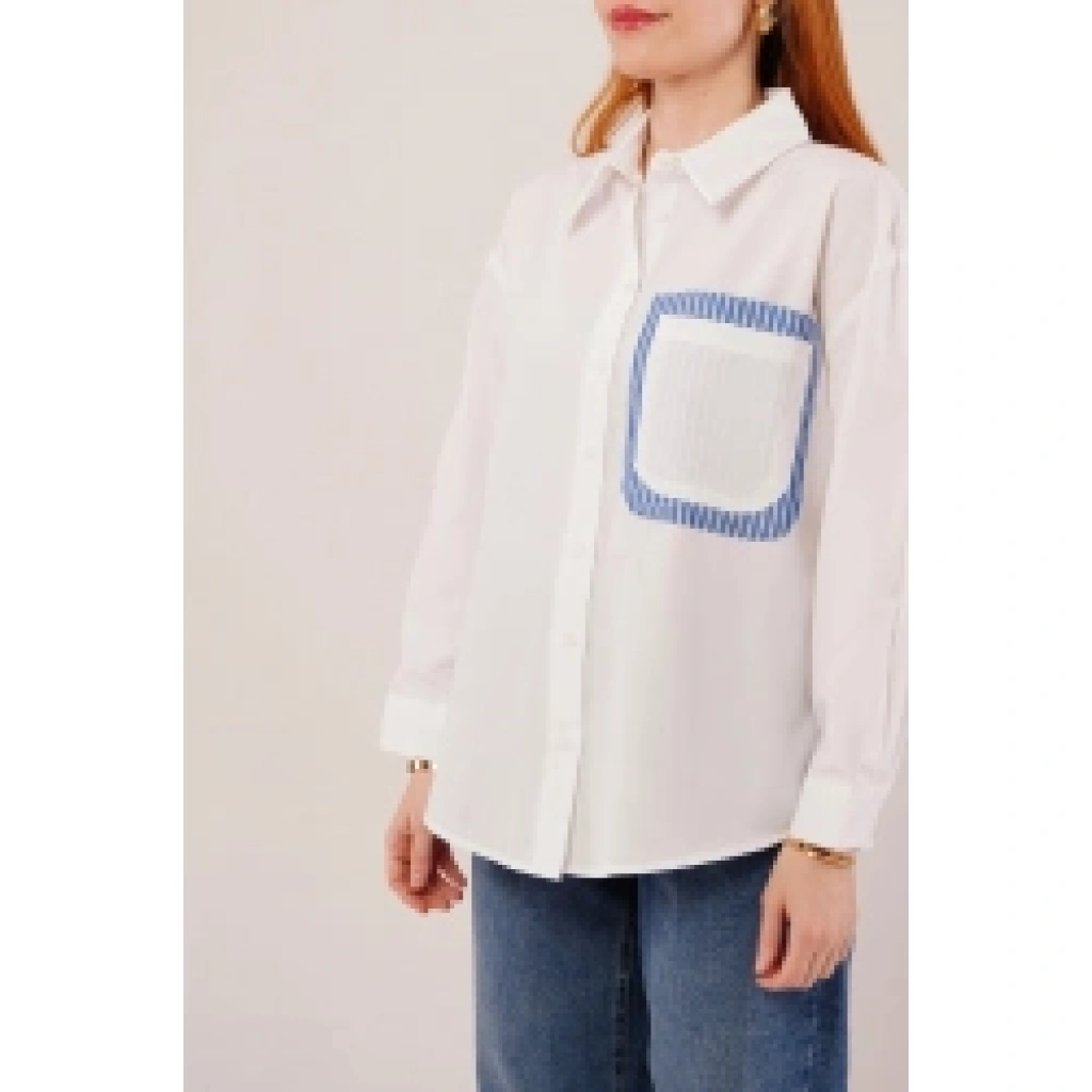 Çizgili Cep Detaylı Beyaz Gömlek