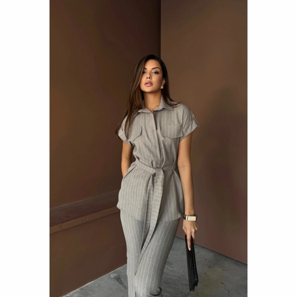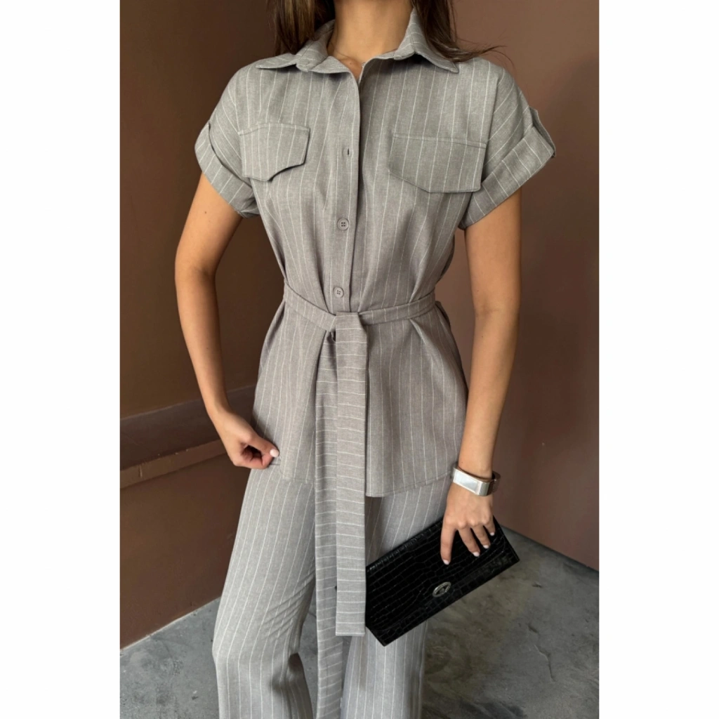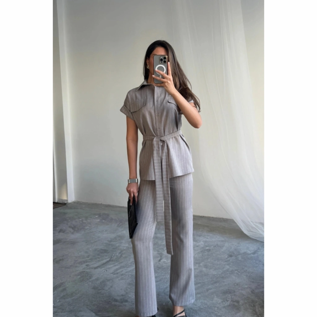 ÇİZGİLİ POLYVİSKON BLUZ - PANTOLON TAKIM - Gri
