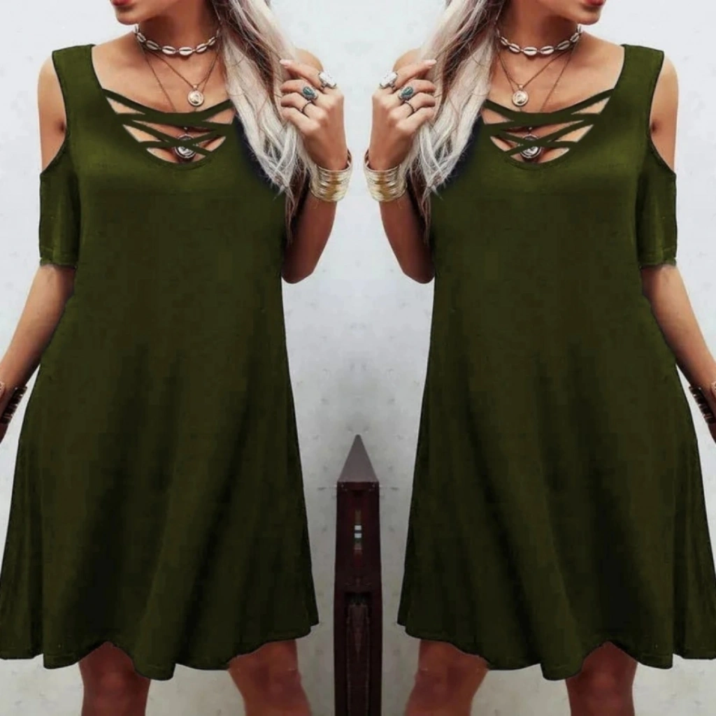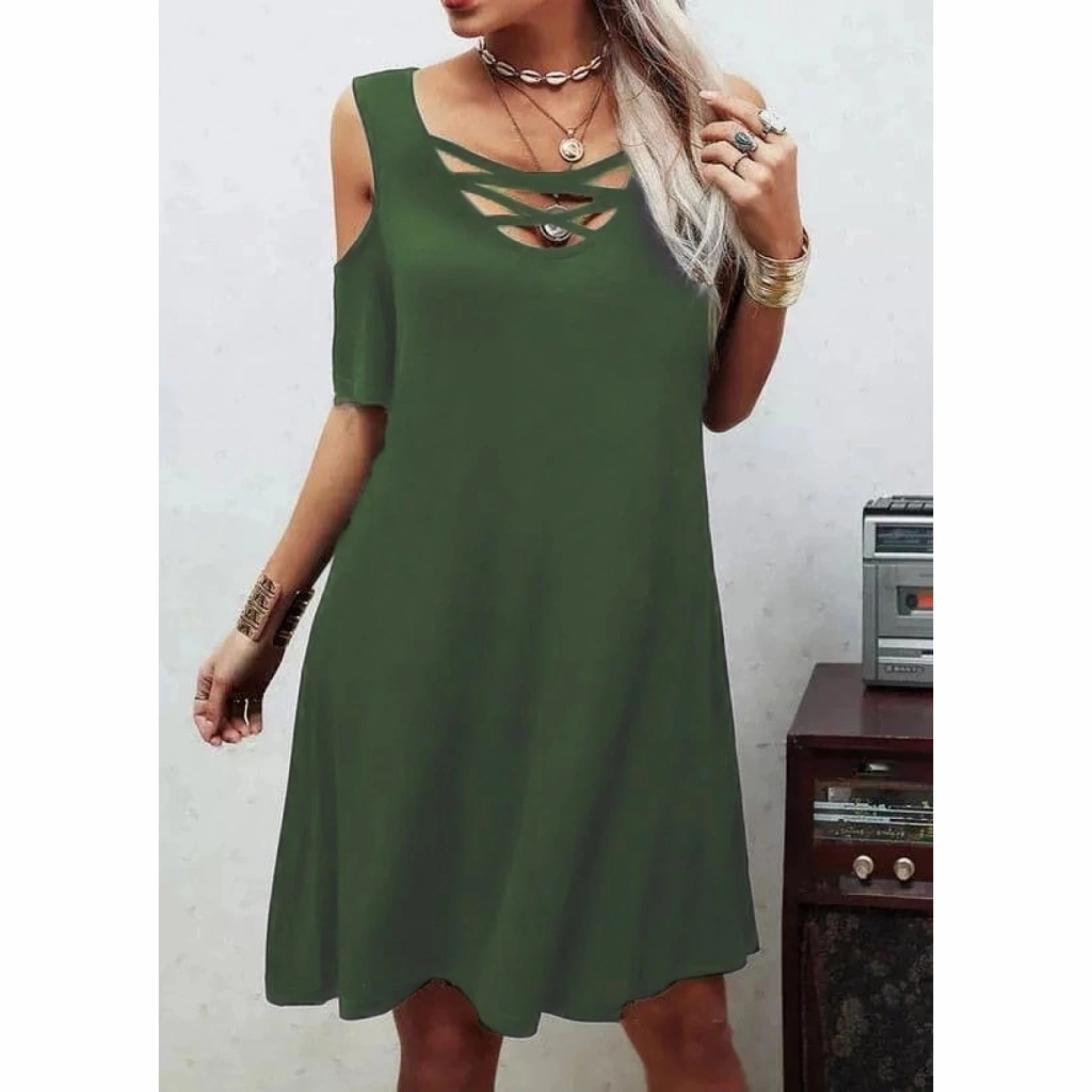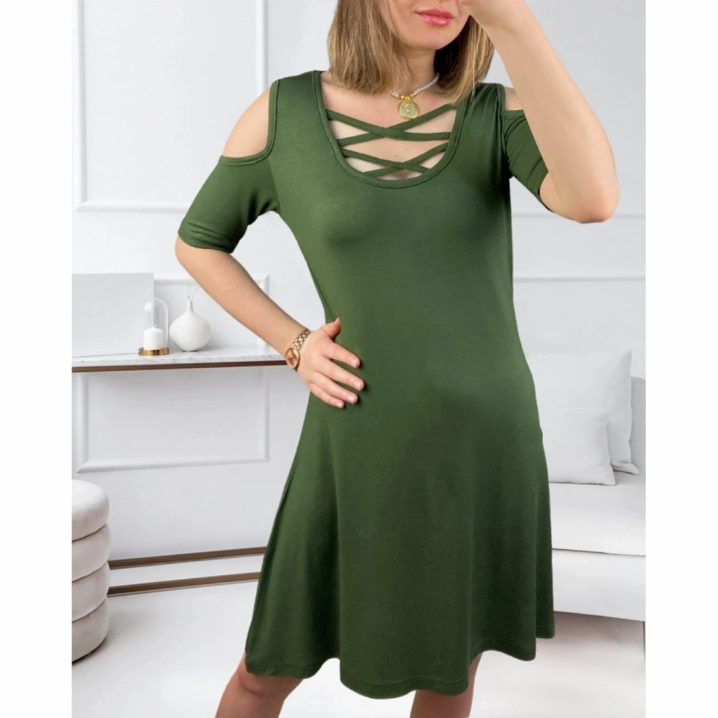 Dekolteli Bağcık Detay Viskon Kumaş Elbise
