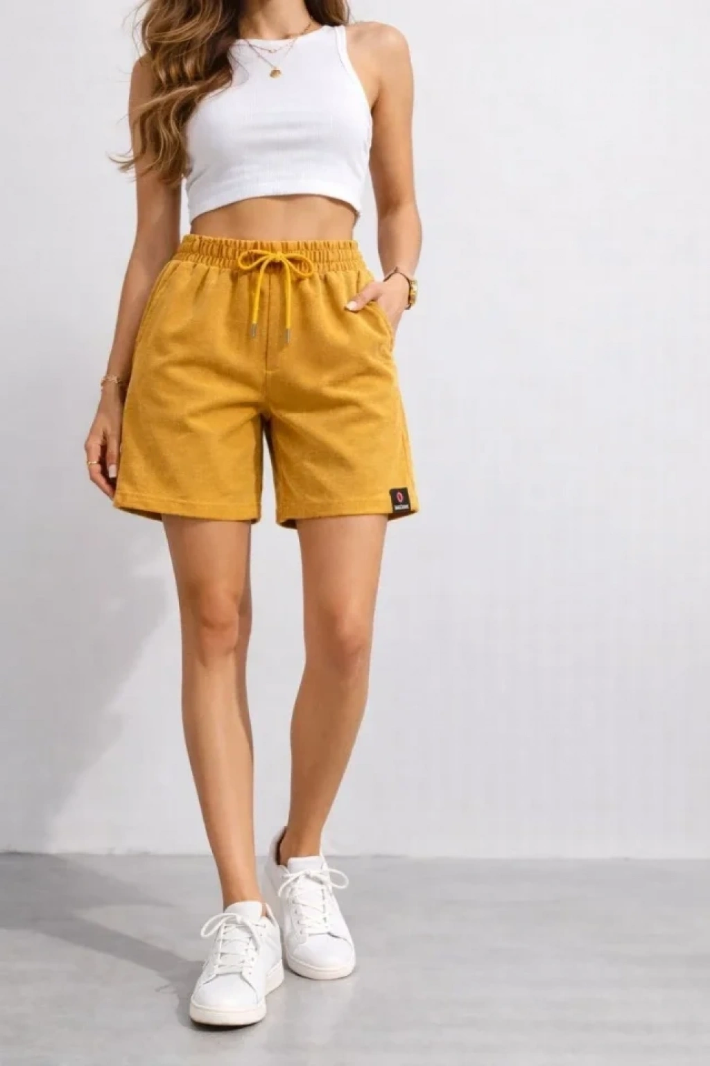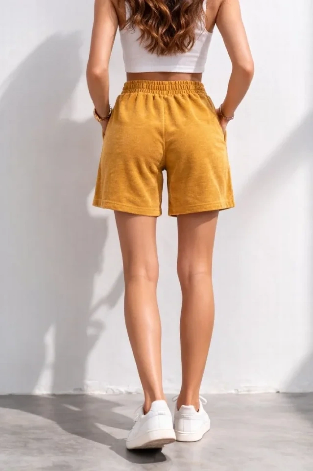 Dokuma Otoban Şort Beli Lastikli Bağcıklı, Cepli, Rahat Kesim Günlük Yazlık Şort - Hardal