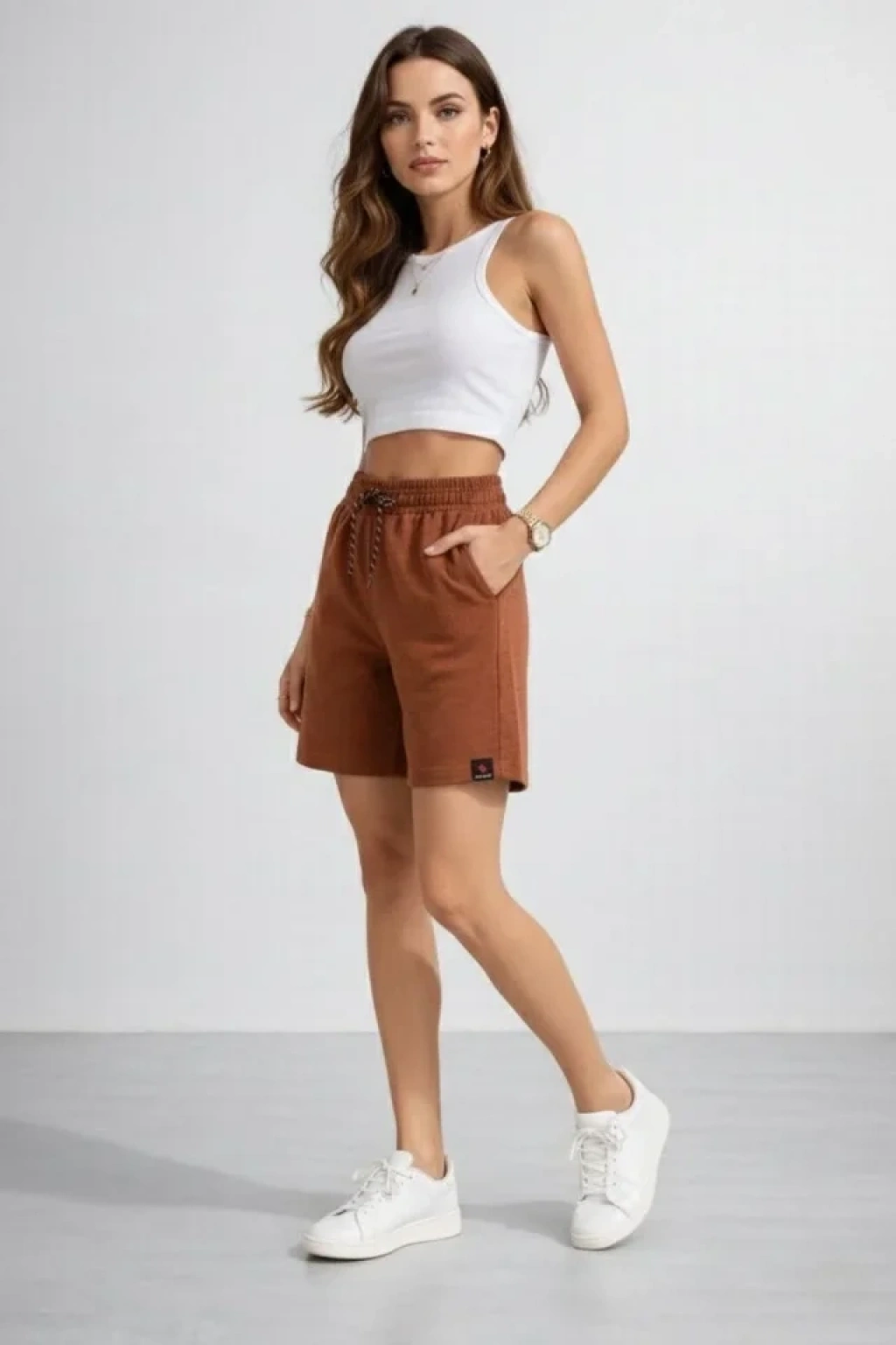 Dokuma Otoban Şort Beli Lastikli Bağcıklı, Cepli, Rahat Kesim Günlük Yazlık Şort - Kahverengi