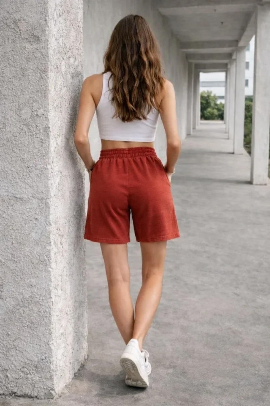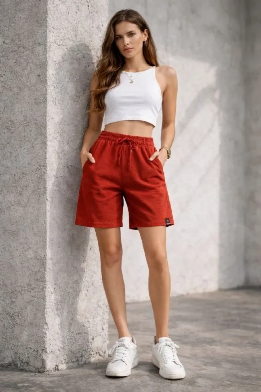 Dokuma Otoban Şort Beli Lastikli Bağcıklı, Cepli, Rahat Kesim Günlük Yazlık Şort - Turuncu