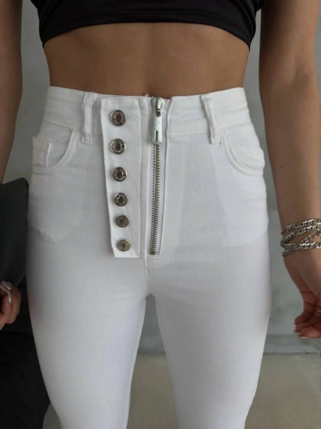 DÜĞME VE FERMUARLI KOT PANTOLON - Beyaz