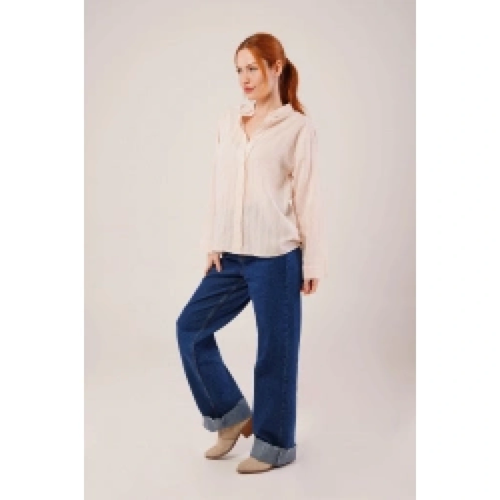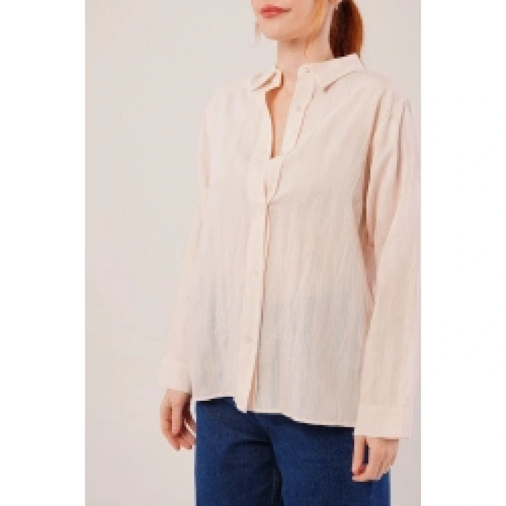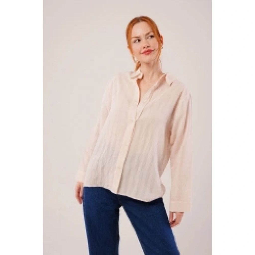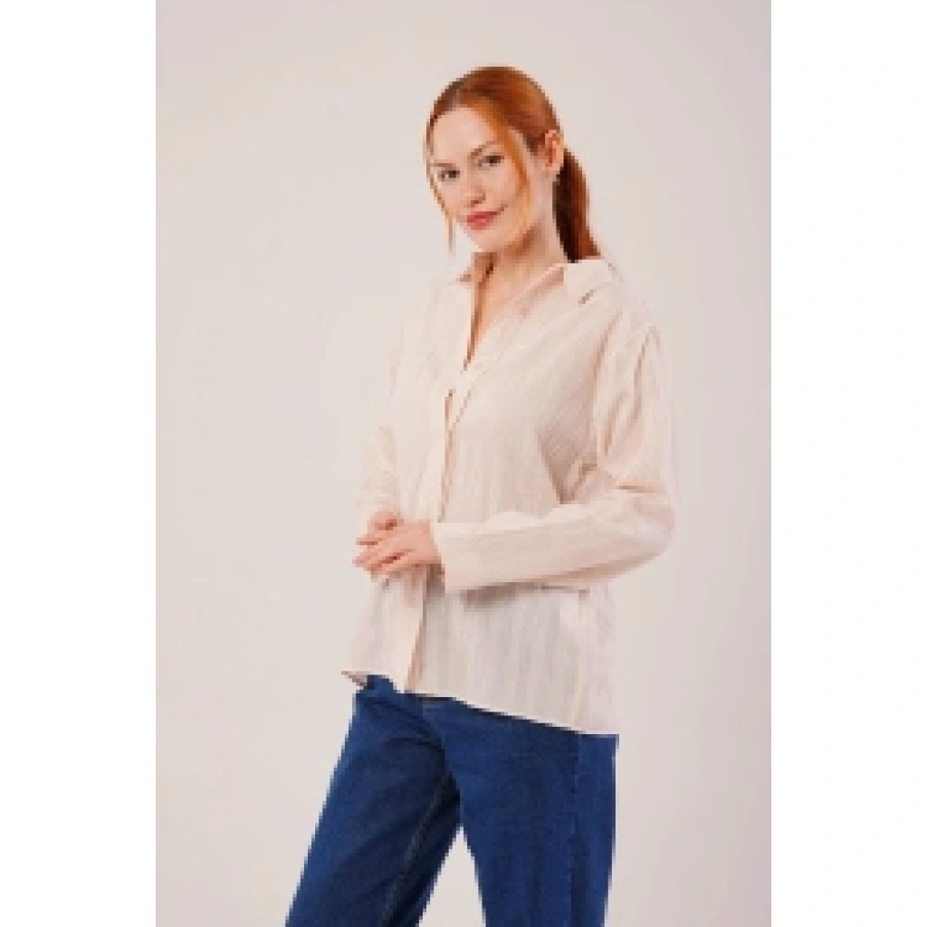 Düğmeli Ve Çizgi Detaylı Krem Gömlek