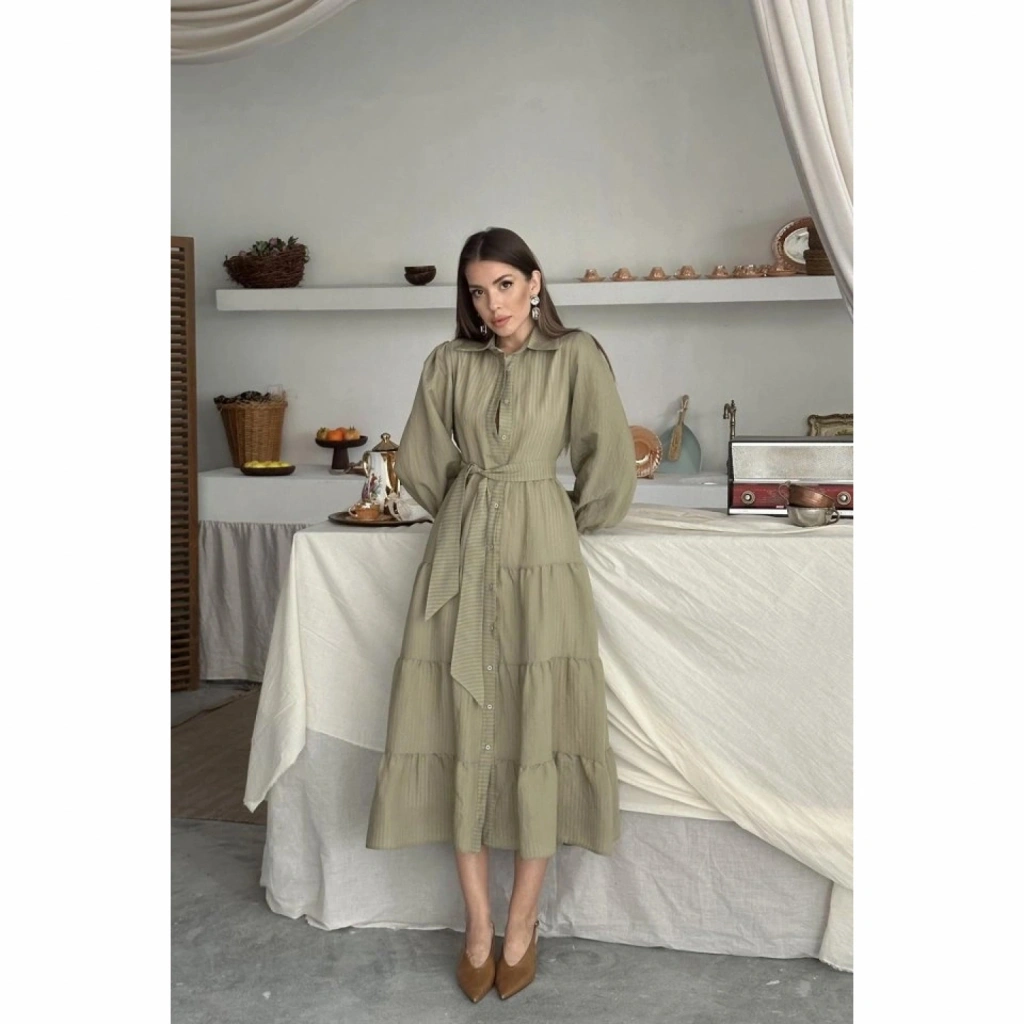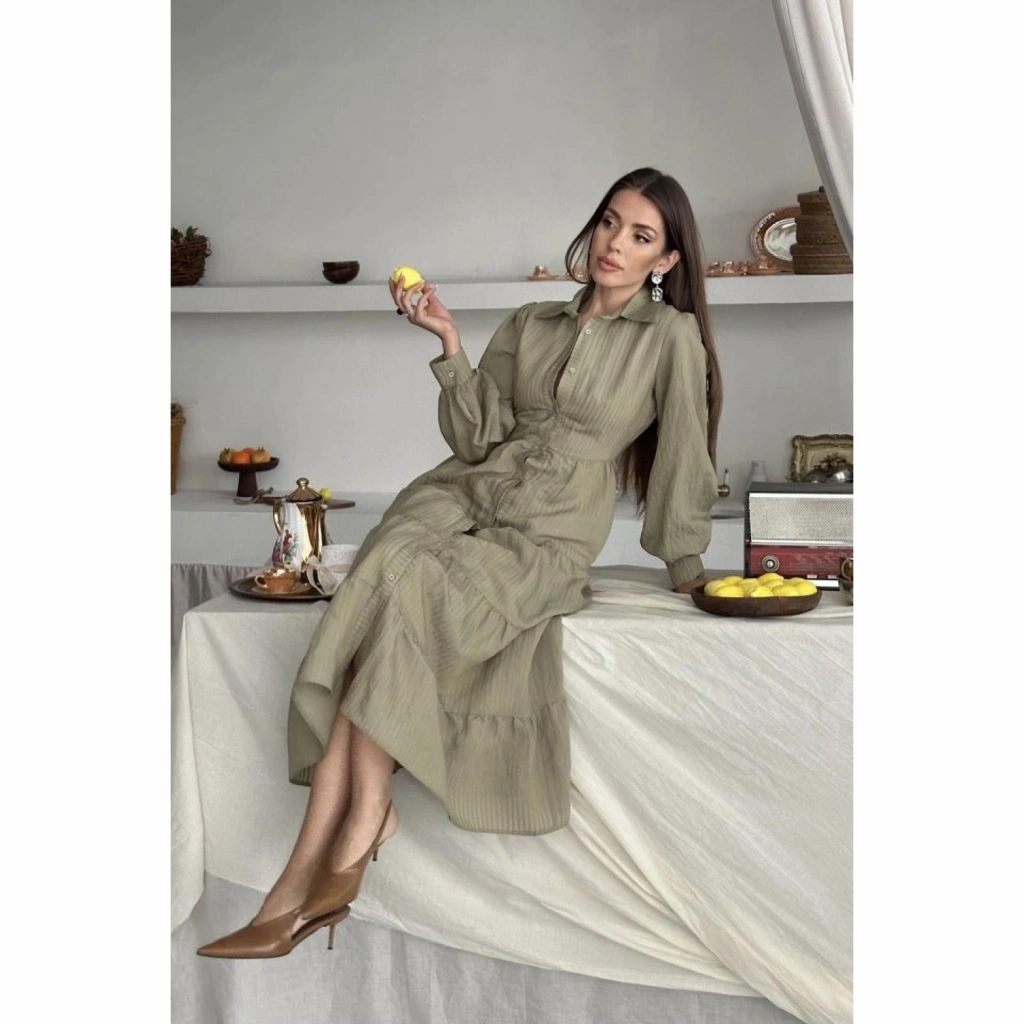 Ekru Çizgi Desenli Uzun Elbise