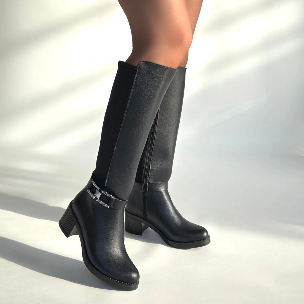 Detay: Topuklu Yandan Fermuarlı Arka Kısmı Streç Diz Altı Çizme
