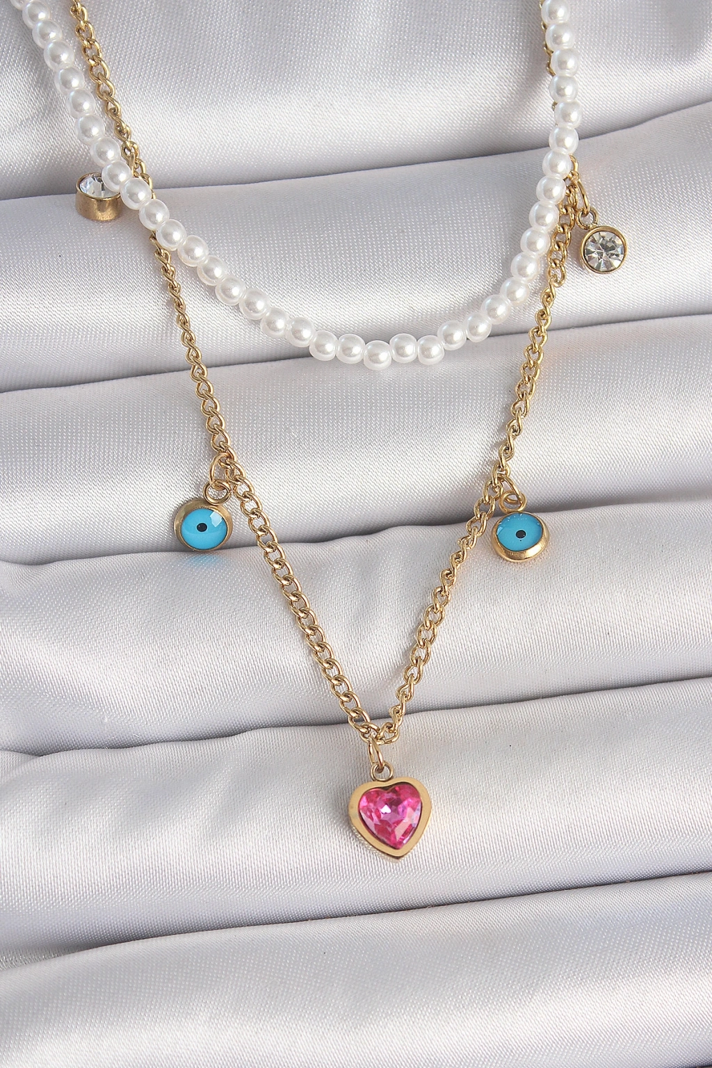 Erb 316L Çelik Gold Renk 2'Li İnci Zincir Model Pembe Taşlı Kalp Figür Nazar Boncuk Detay Kadın Kolye
