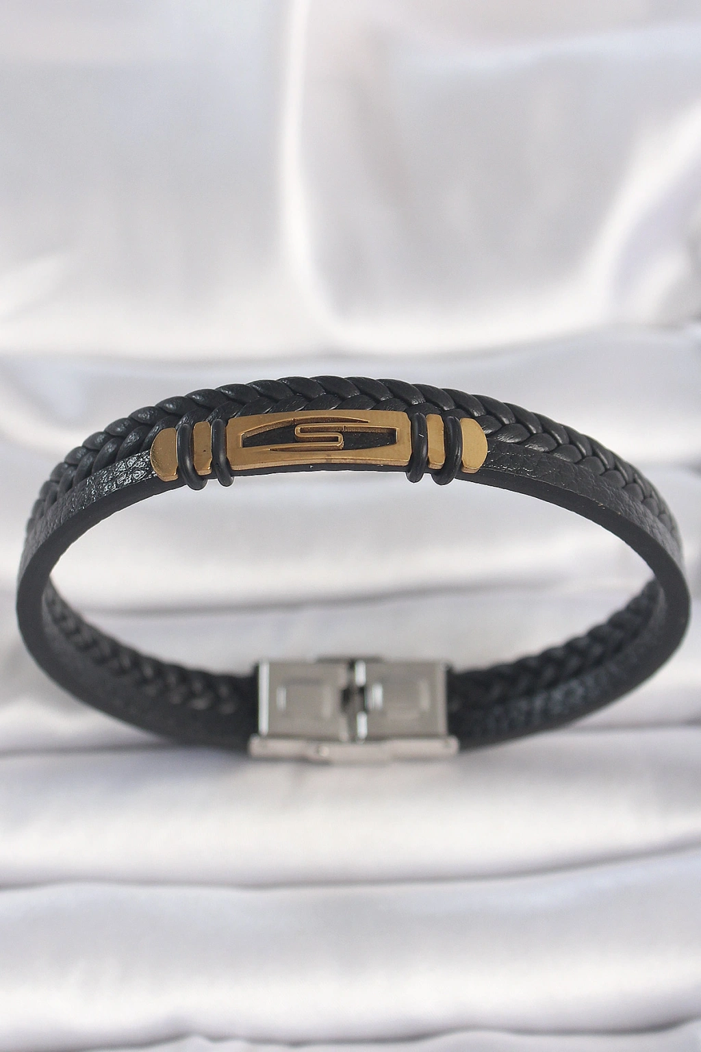 Erb Gold Renk Metal Labirent Tasarım Siyah Renk Deri Erkek Bileklik