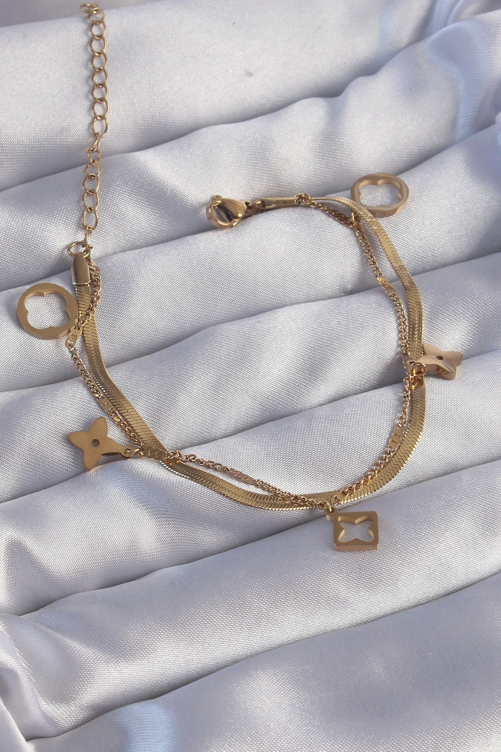 Erb 316L Çelik Gold Renk Çift Zincir Yonca Tasarım Bileklik