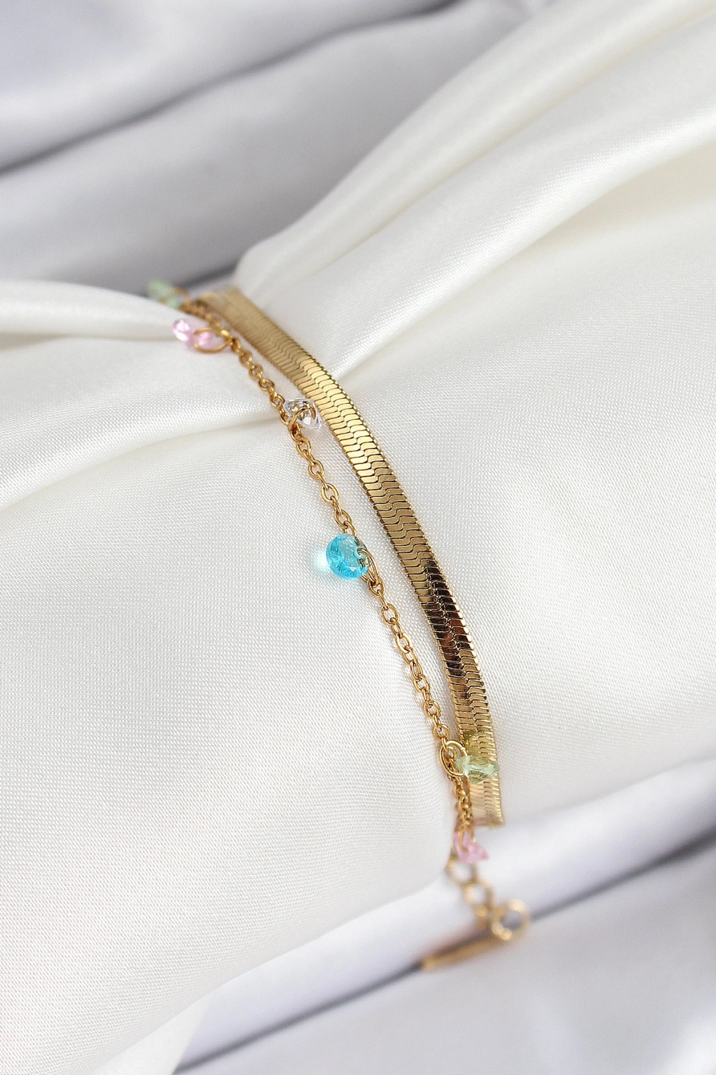 Erb 316L Çelik Gold Renk Karışık Renkli Kristal Taşlı 2'li Kadın Bileklik