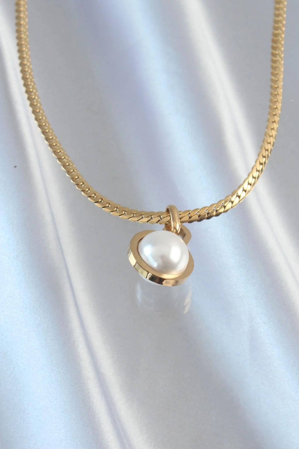 Erb 316L Çelik Gold Renk Yassı Zincir İnci Taşlı Kolye