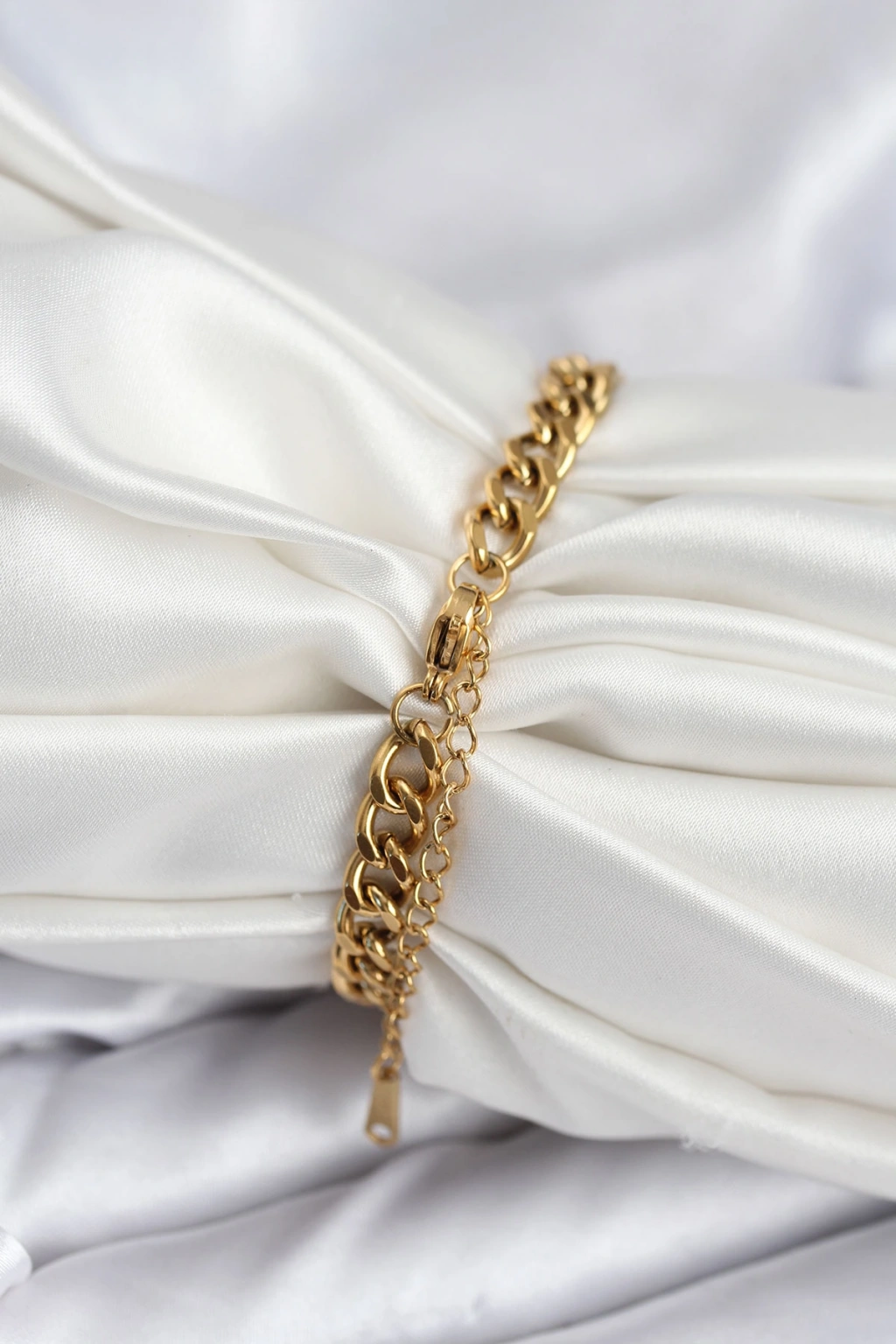 Erb Gold Renk Zincir Model Zirkon Taşlı Pirinç Asansörlü Kadın Bileklik