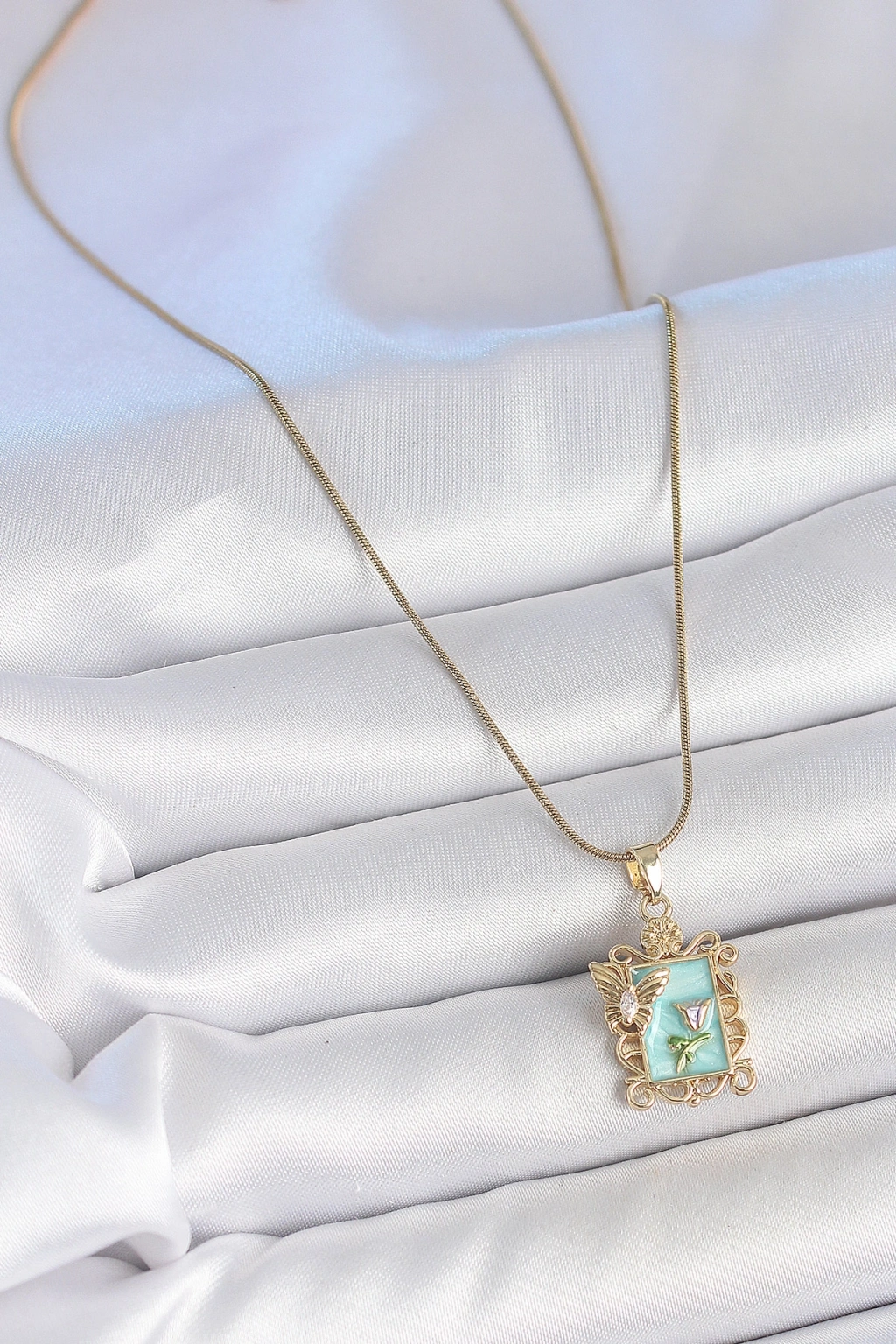 Erb 316L Çelik Gold Renk Zincir Mavi Mineli Çiçek İşlemeli Zirkon Taşlı Kelebek Detay Portre Model Kadın Kolye