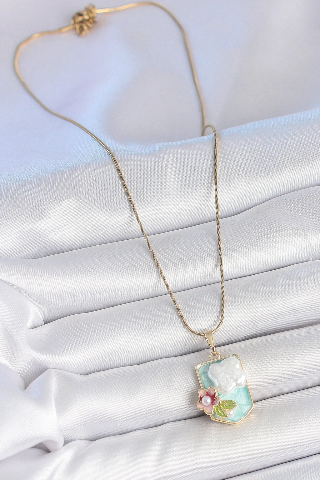 Erb 316L Çelik Gold Renk Zincir Mavi Mineli İncili Çiçek İşlemeli Portre Model Kadın Kolye