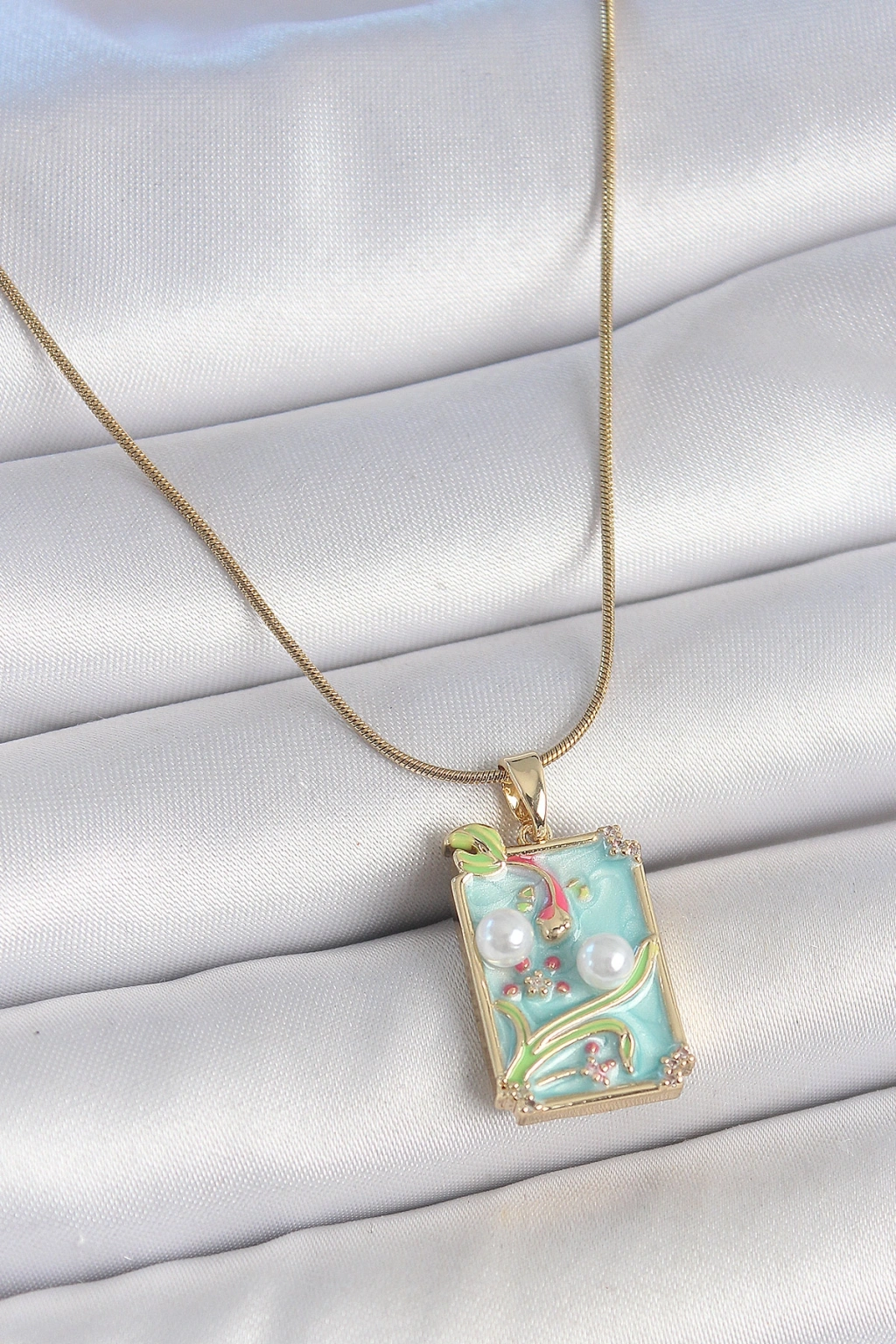 Erb 316L Çelik Gold Renk Zincir Mavi Mineli İncili Çiçek İşlemeli Portre Model Kadın Kolye