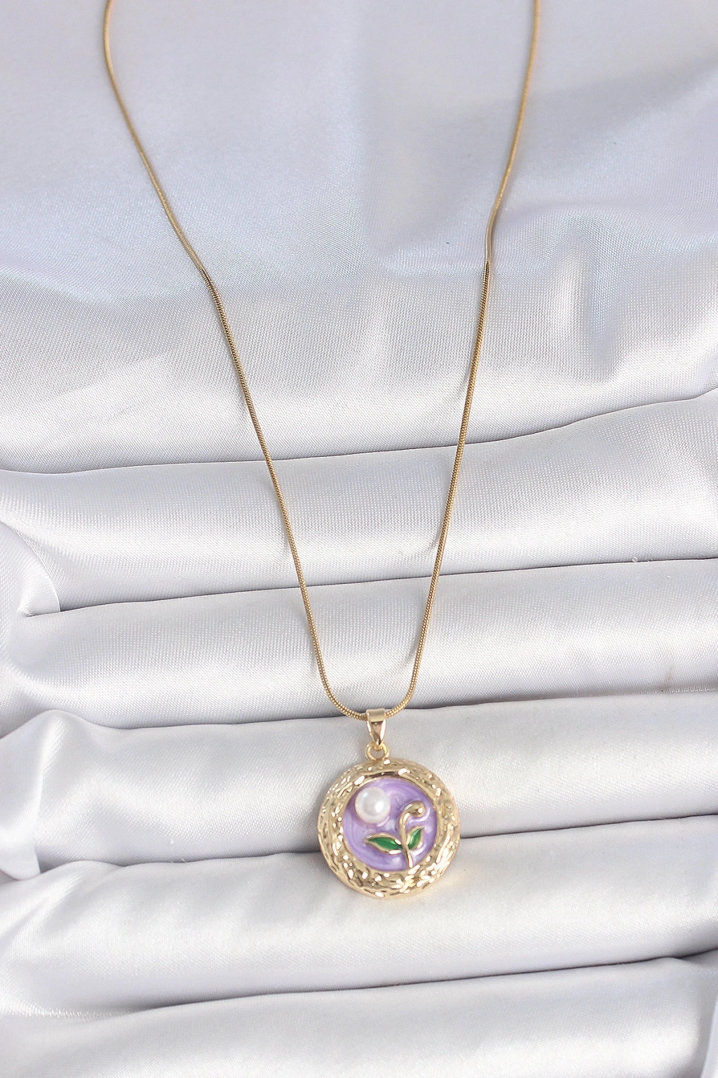 Erb 316L Çelik Gold Renk Zincir Mor Çiçek İşlemeli İnci Detay Potre Model Kadın Kolye