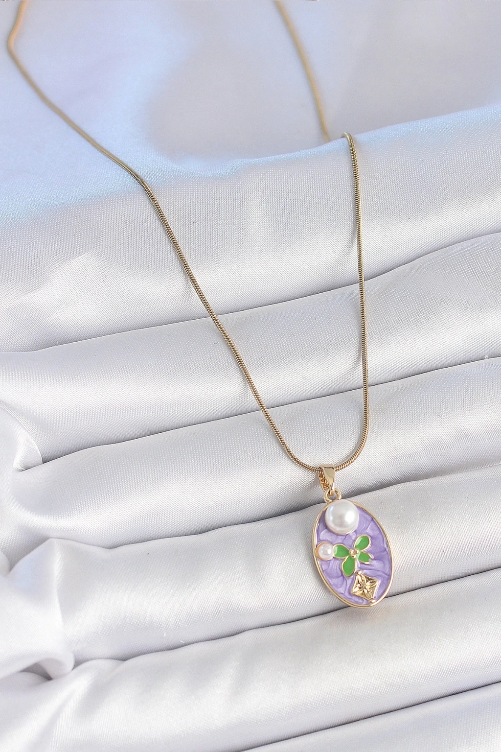 Erb 316L Çelik Gold Renk Zincir Mor Mineli Oval İncili Çiçek İşlemeli Portre Model Kadın Kolye