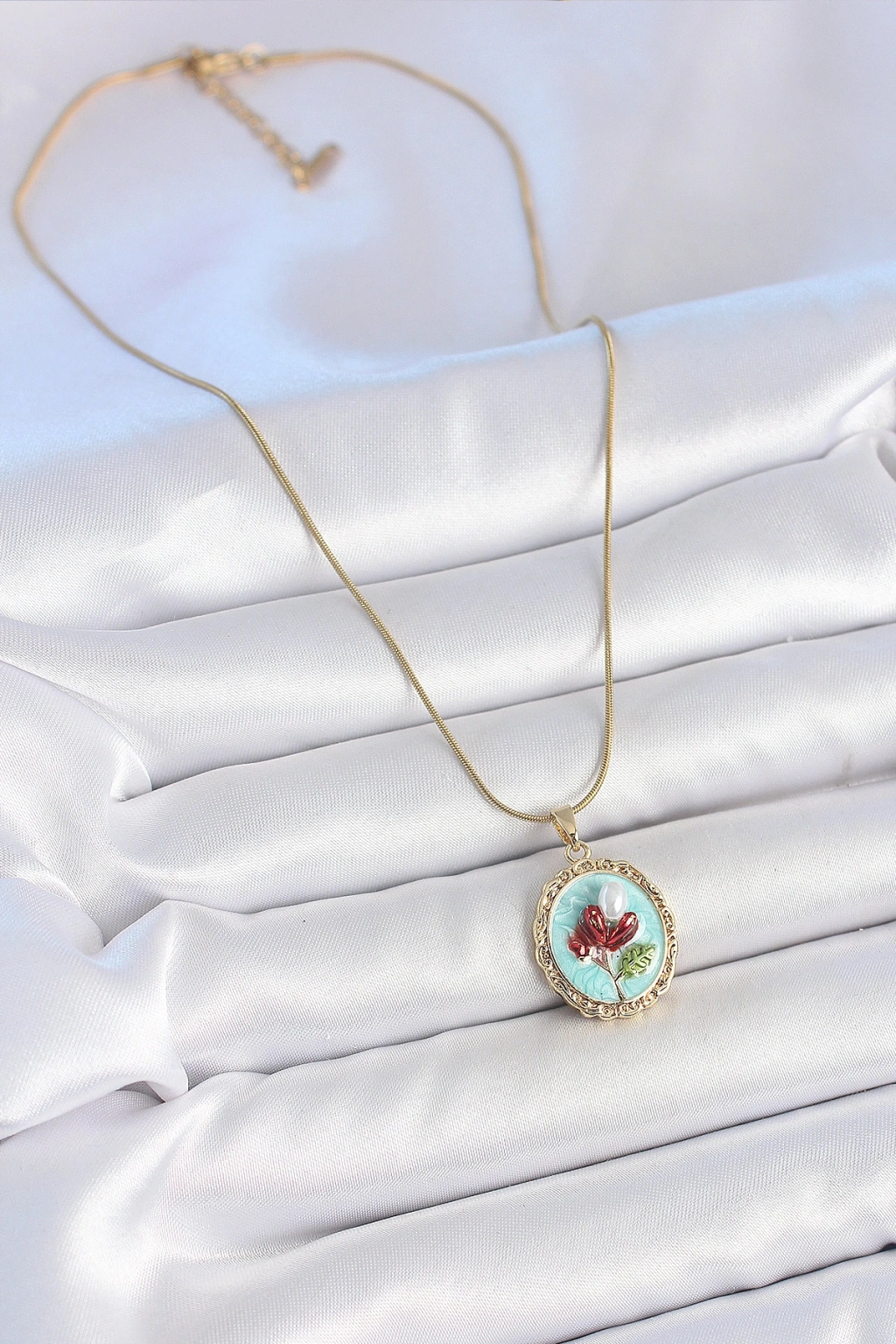 Erb 316L Çelik Gold Renk Zincir Turkuaz Mineli İncili Çiçek İşlemeli Portre Model Kadın Kolye