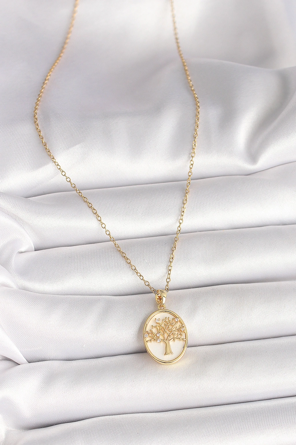 Erb 316L Çelik Gold Renk Zincir Zirkon Taş Detaylı Beyaz Mineli Ağaç İşlemeli Portre Model Kadın Kolye