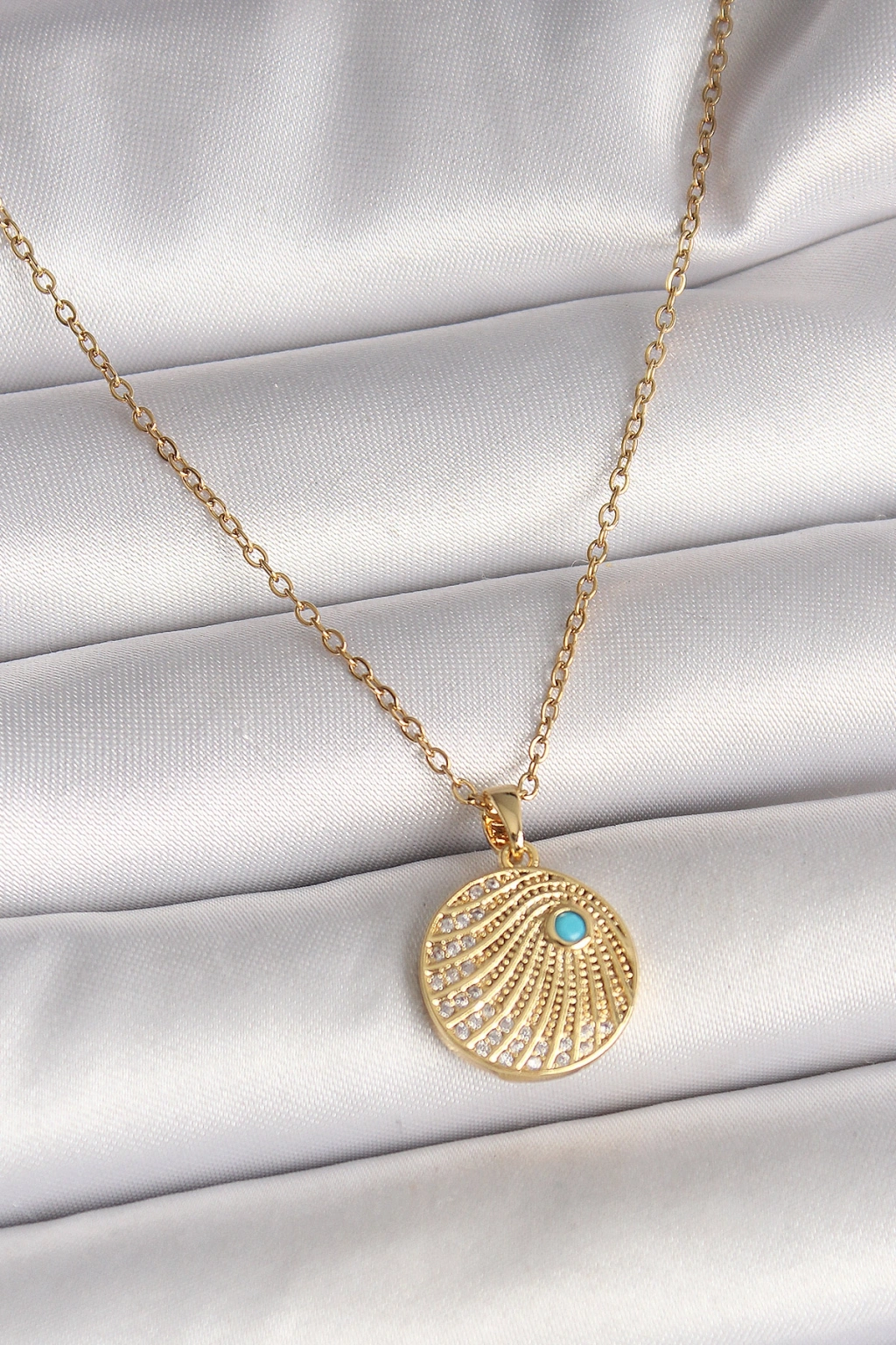 Erb 316L Çelik Gold Renk Zincir Zirkon Taş İşlemeli Mavi Taş Detaylı Madalyon Model Kadın Kolye