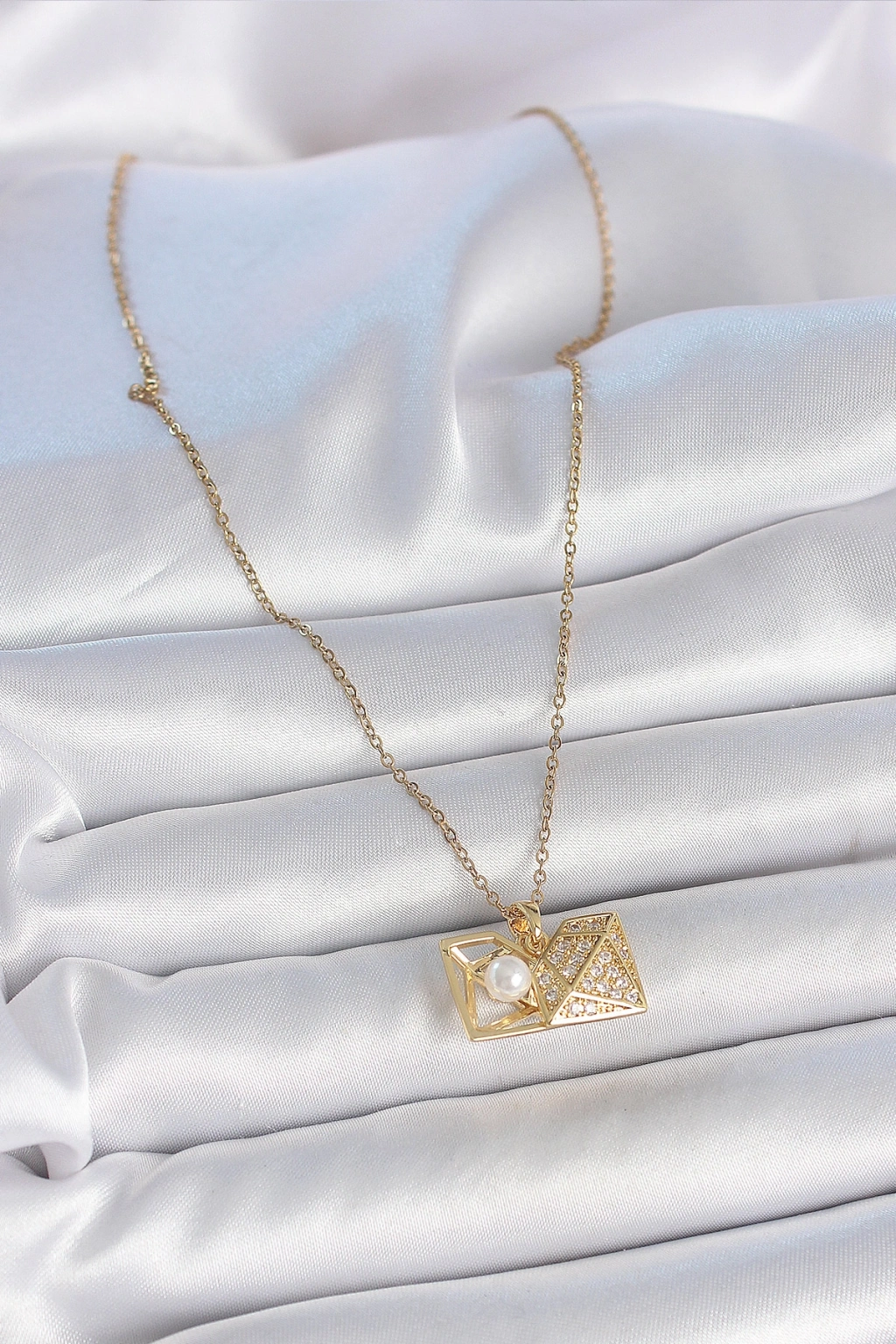 Erb 316L Çelik Gold Renk Zincir Zirkon Taşlı Açılır İncili Elmas Model Kadın Kolye