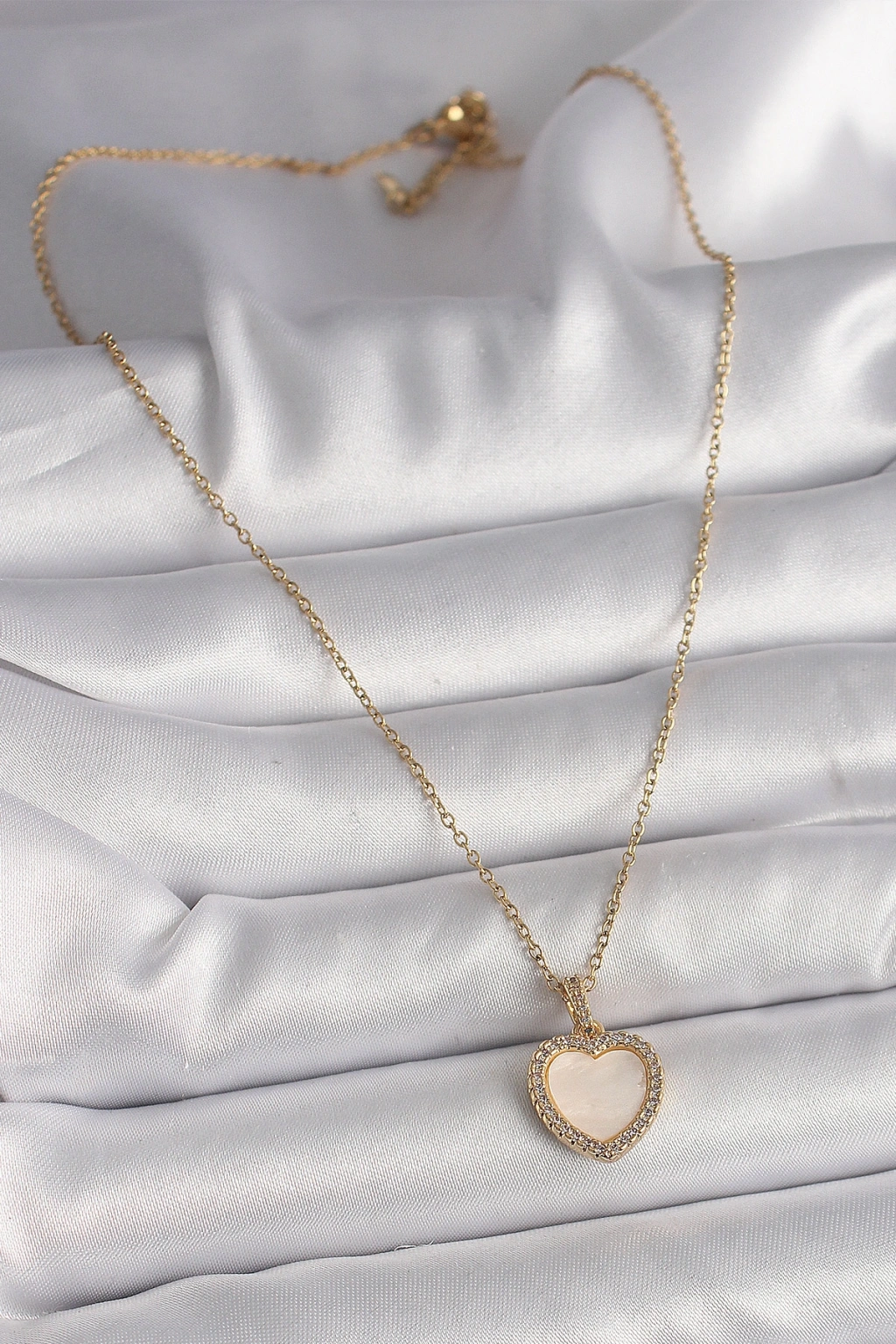 Erb 316L Çelik Gold Renk Zincir Zirkon Taşlı Beyaz Mineli Kalp Model Kadın Kolye