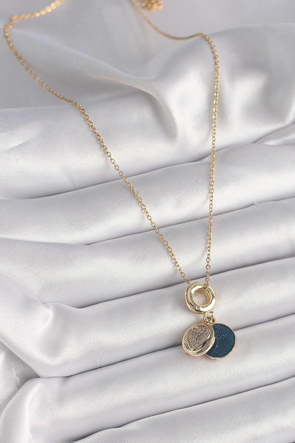 Erb 316L Çelik Gold Renk Zincir Zirkon Taşlı Kalp Model Mavi Simli Kadın Kolye
