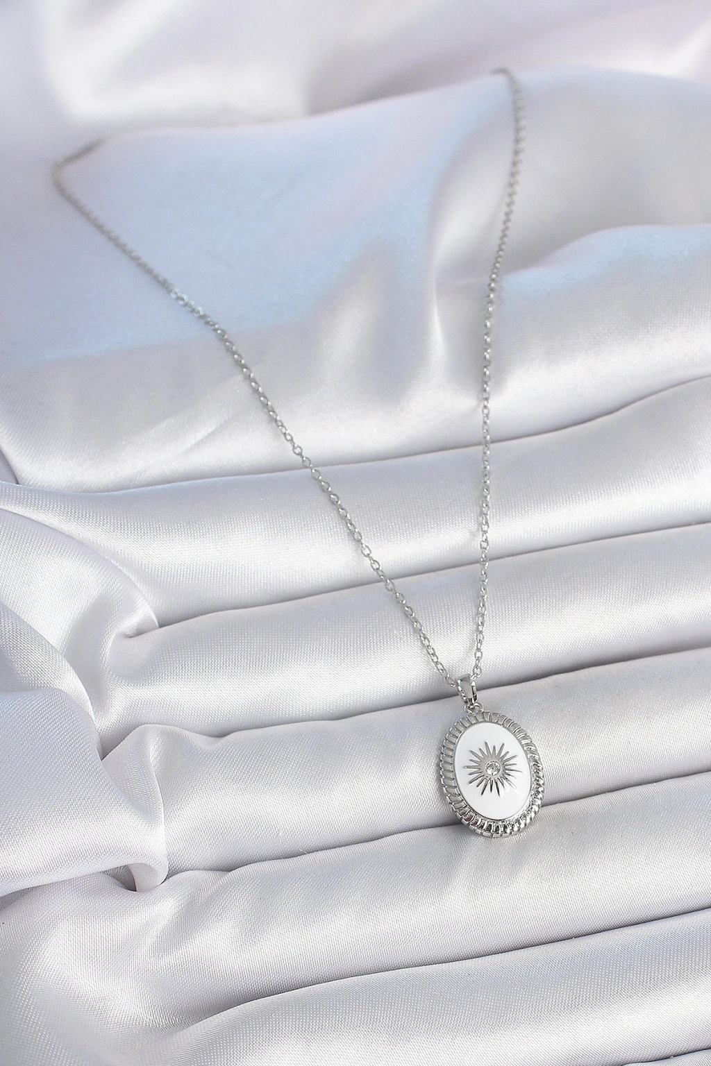Erb 316L Çelik Gümüş Renk Beyaz Mineli Güneş İşlemeli Nazar Boncuk Detay Madalyon Model Kadın Kolye