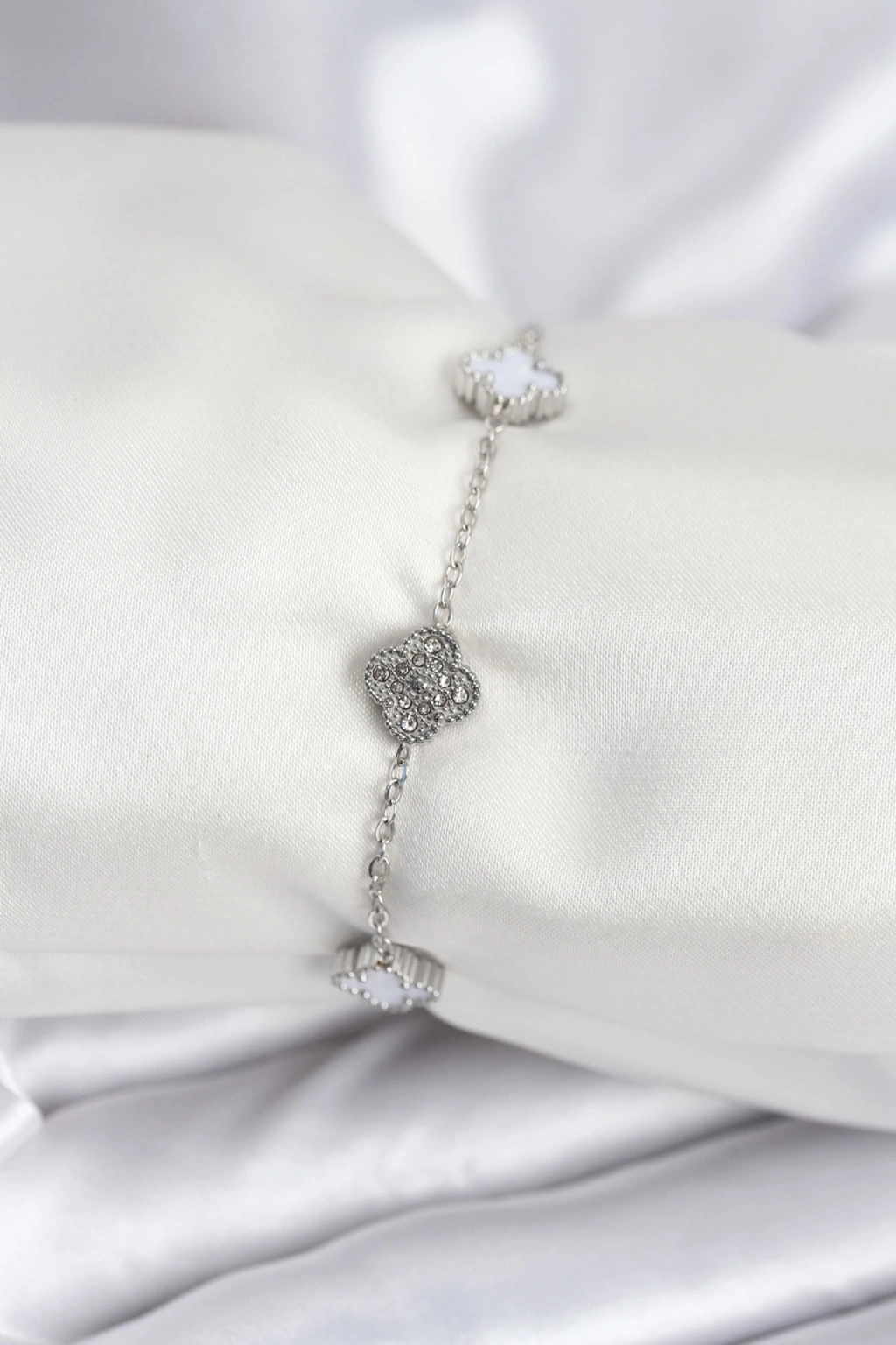 Erb 316L Çelik Gümüş Renk Beyaz Ve Zirkon Taşlı Baby Boy Yonca Kadın Bileklik