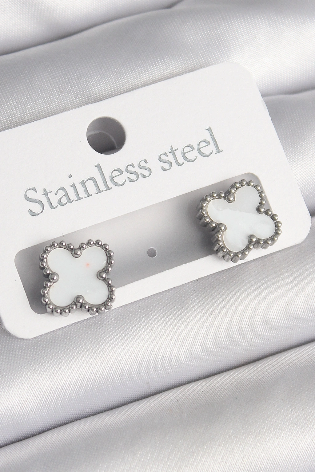 Erb 316L Çelik Gümüş Renk Beyaz Yonca Model Kadın Küpe