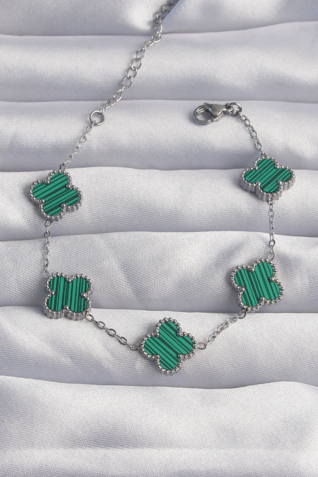 Erb 316L Çelik Gümüş Renk Çizgili Yeşil Mineli Yonca Bileklik