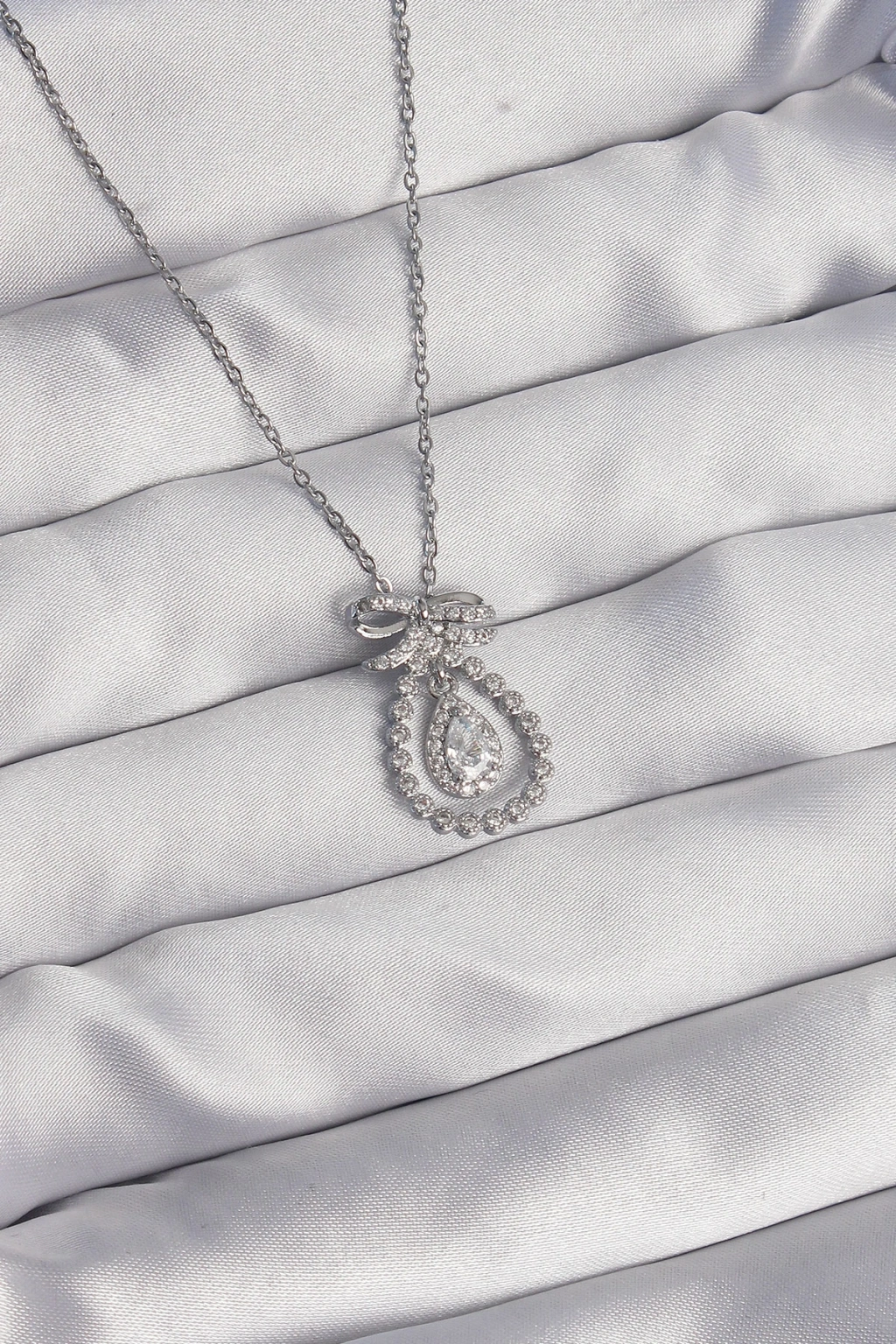 Erb 316L Çelik Gümüş Renk Fiyonk Detaylı Zirkon Taşlı Damla Model Kolye
