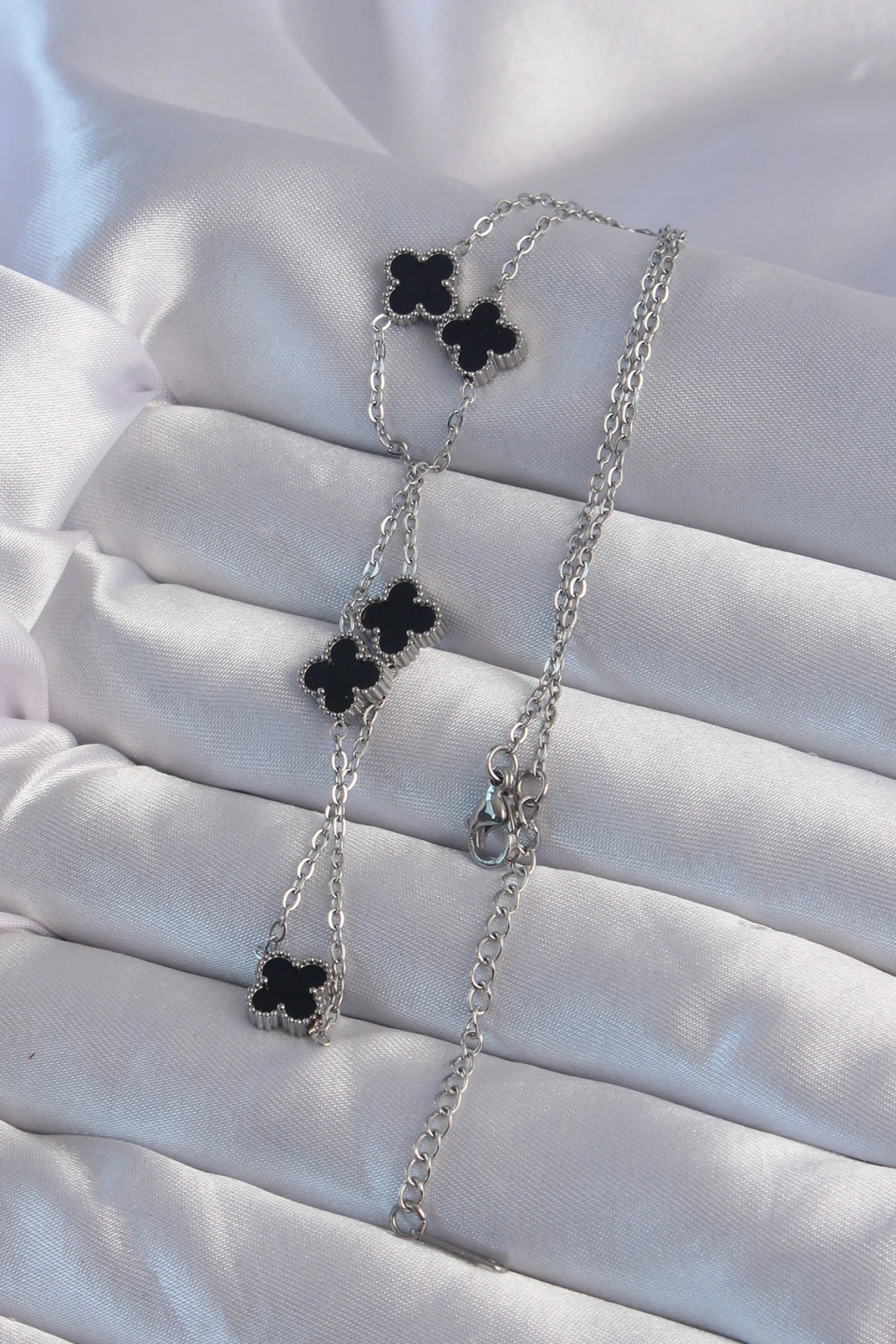 Erb 316L Çelik Gümüş Renk Minimal Siyah Mineli Yonca Kolye