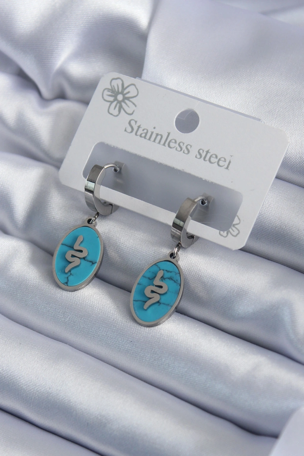 Erb 316L Çelik Gümüş Renk Oval Mavi Taşlı Yılan Figür Kadın Küpe