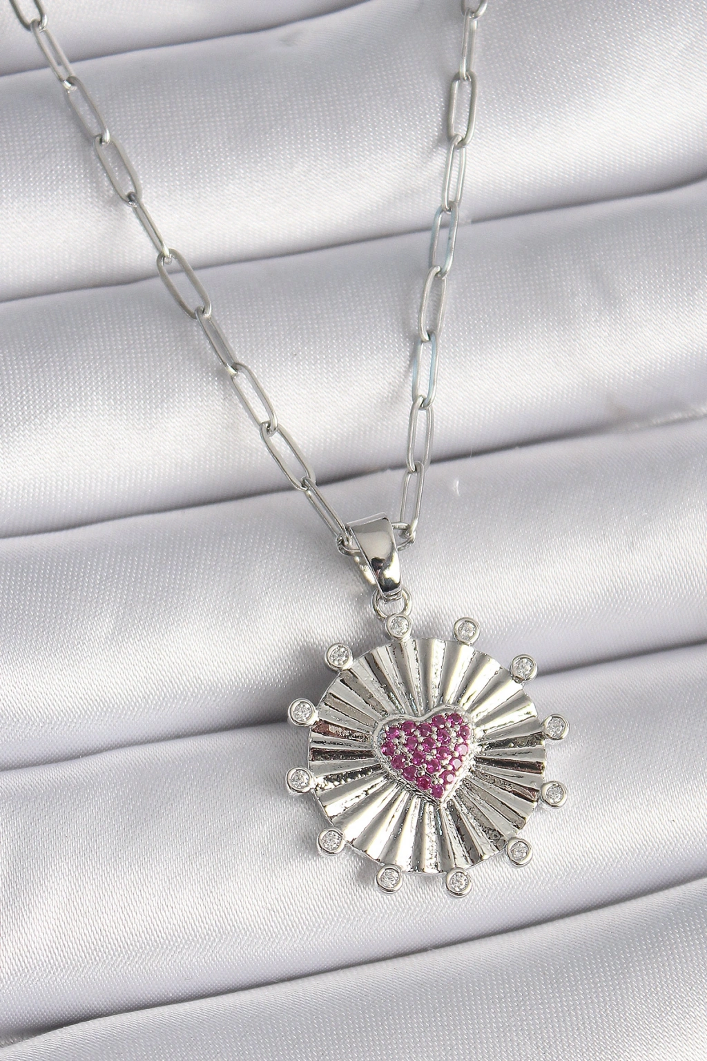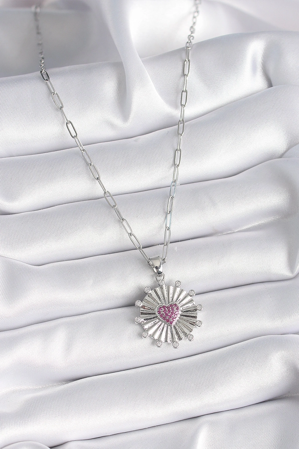 Erb 316L Çelik Gümüş Renk Pembe Zirkon Taşlı Kalp İşleme Madalyon Model Kadın Kolye