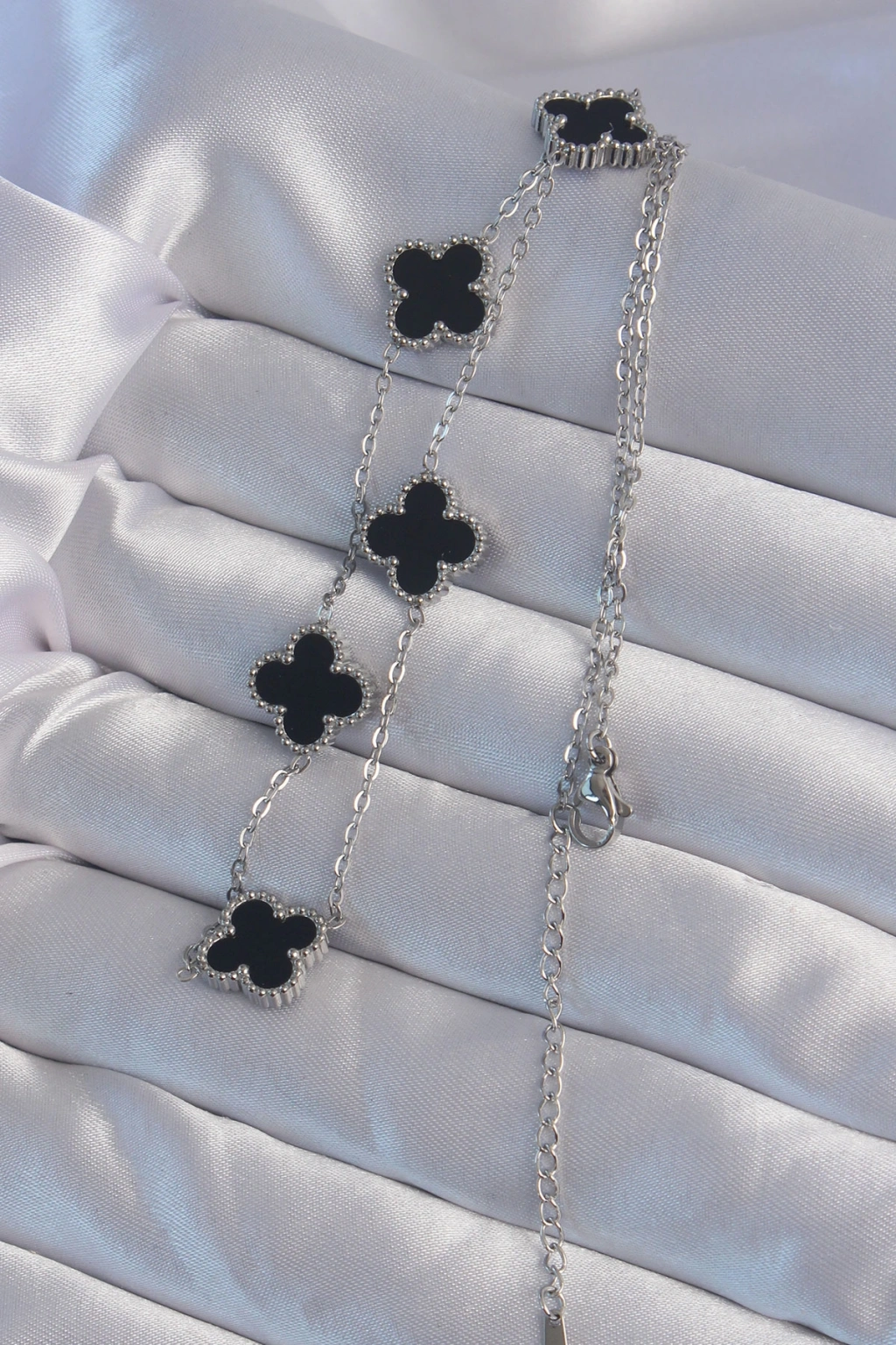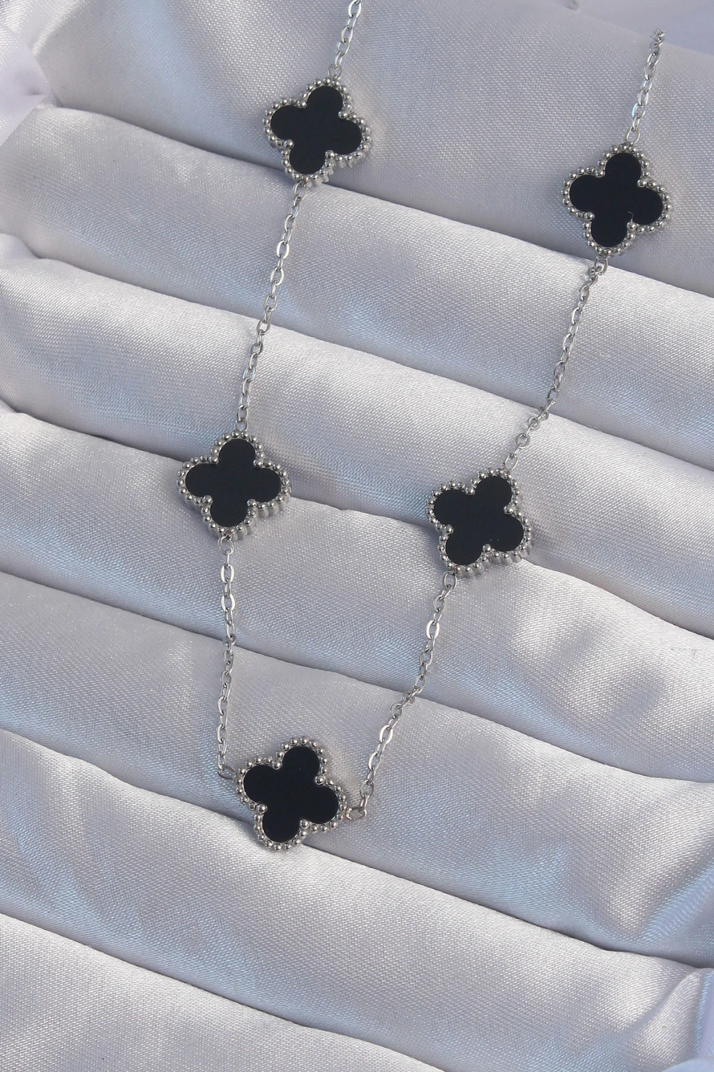 Erb 316L Çelik Gümüş Renk Siyah Mineli Yonca Kolye