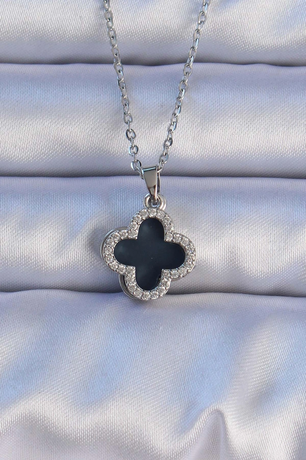 Erb 316L Çelik Gümüş Renk Siyah Mineli Zirkon Taşlı Yonca Figürlü Kolye