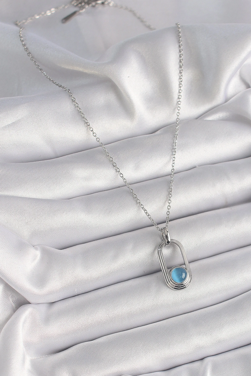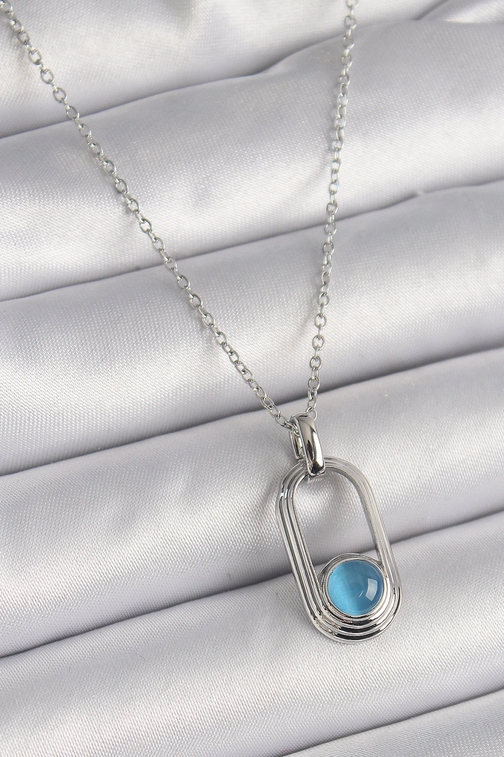 Erb 316L Çelik Gümüş Renk Zincir Mavi Kedi Göz Model Kadın Kolye
