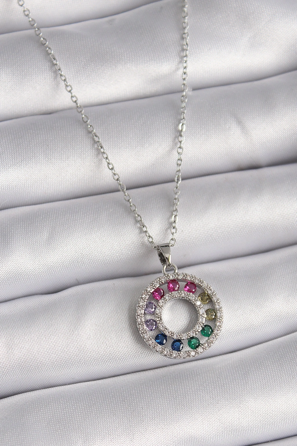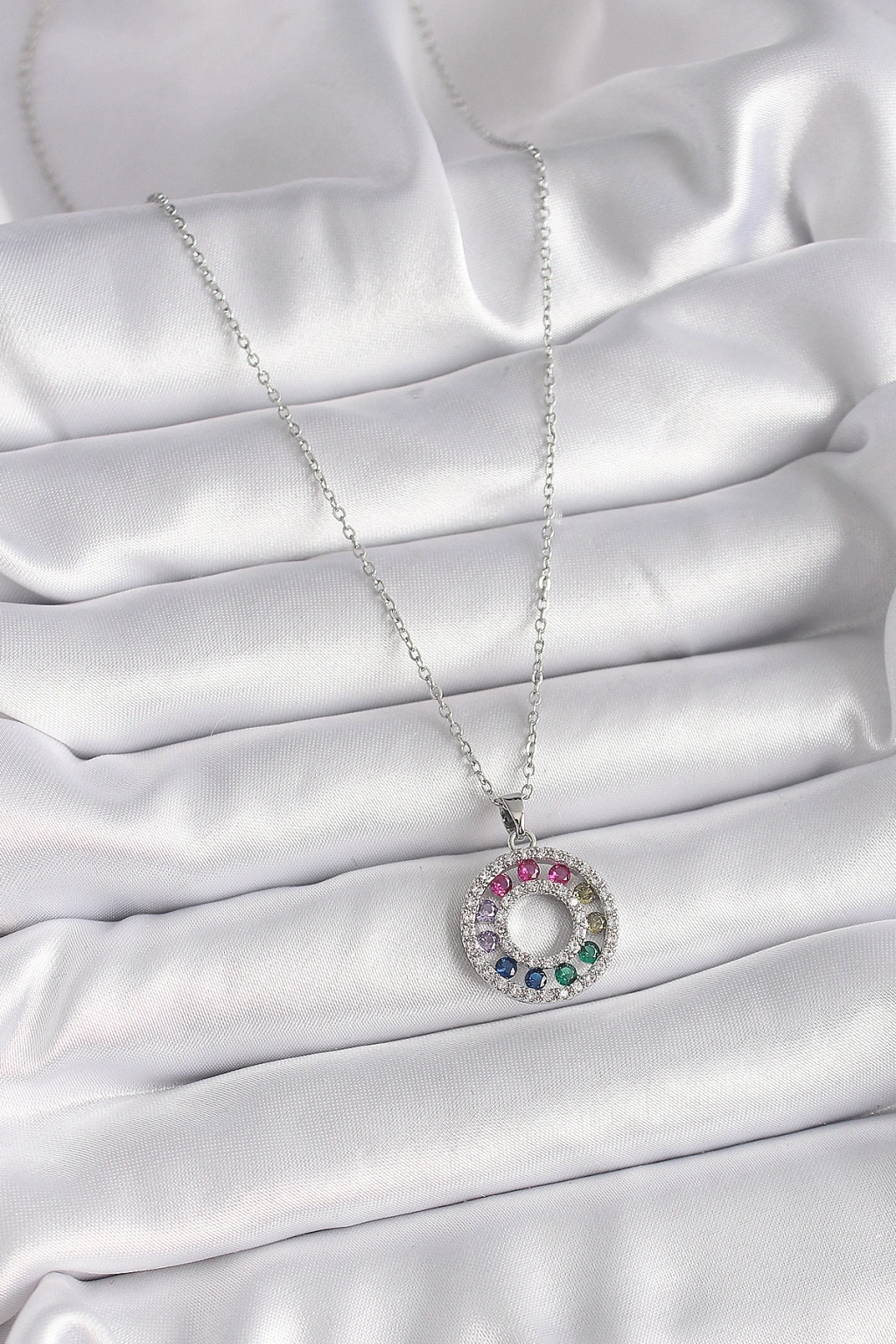 Erb 316L Çelik Gümüş Renk Zincir Renkli Zirkon Taşlı Madalyon Model Kadın Kolye