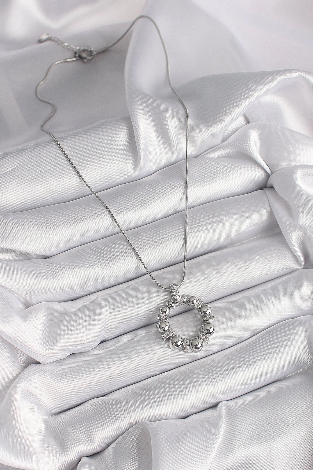 Erb 316L Çelik Gümüş Renk Zincir Zirkon Taş Detaylı Bombeli Halka Model Kadın Kolye