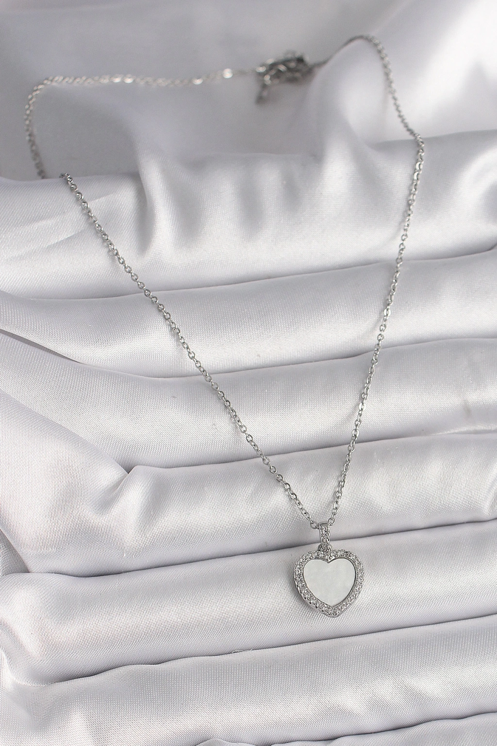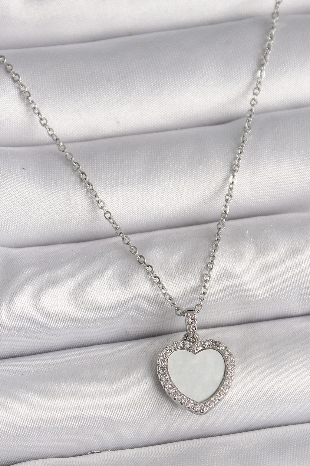Erb 316L Çelik Gümüş Renk Zincir Zirkon Taşlı Beyaz Mineli Kalp Model Kadın Kolye