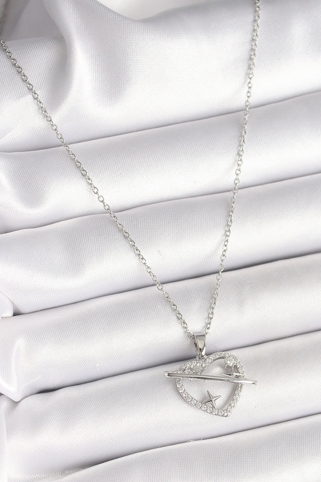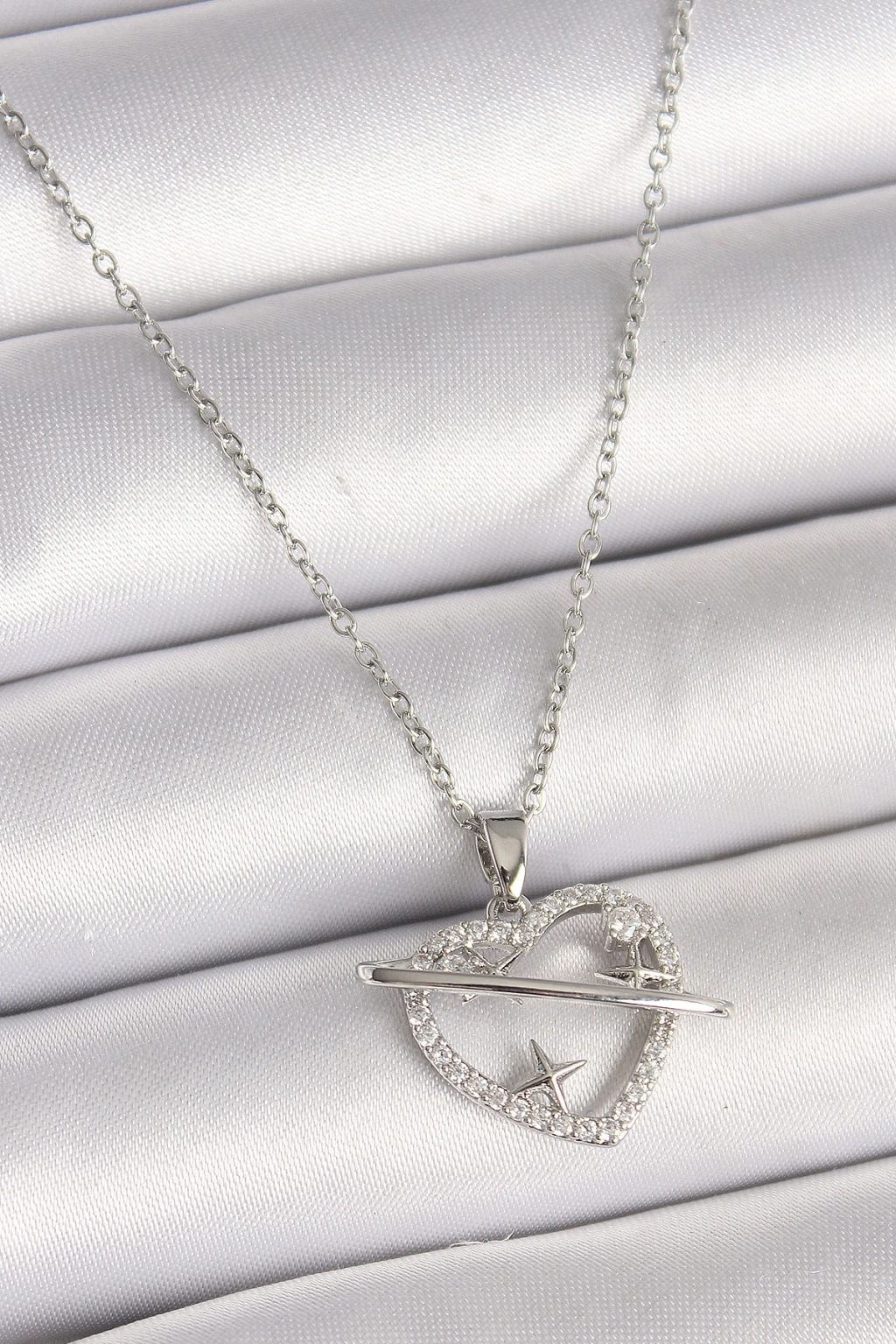 Erb 316L Çelik Gümüş Renk Zincir Zirkon Taşlı Kalp Model Yıldız Detay Kadın Kolye