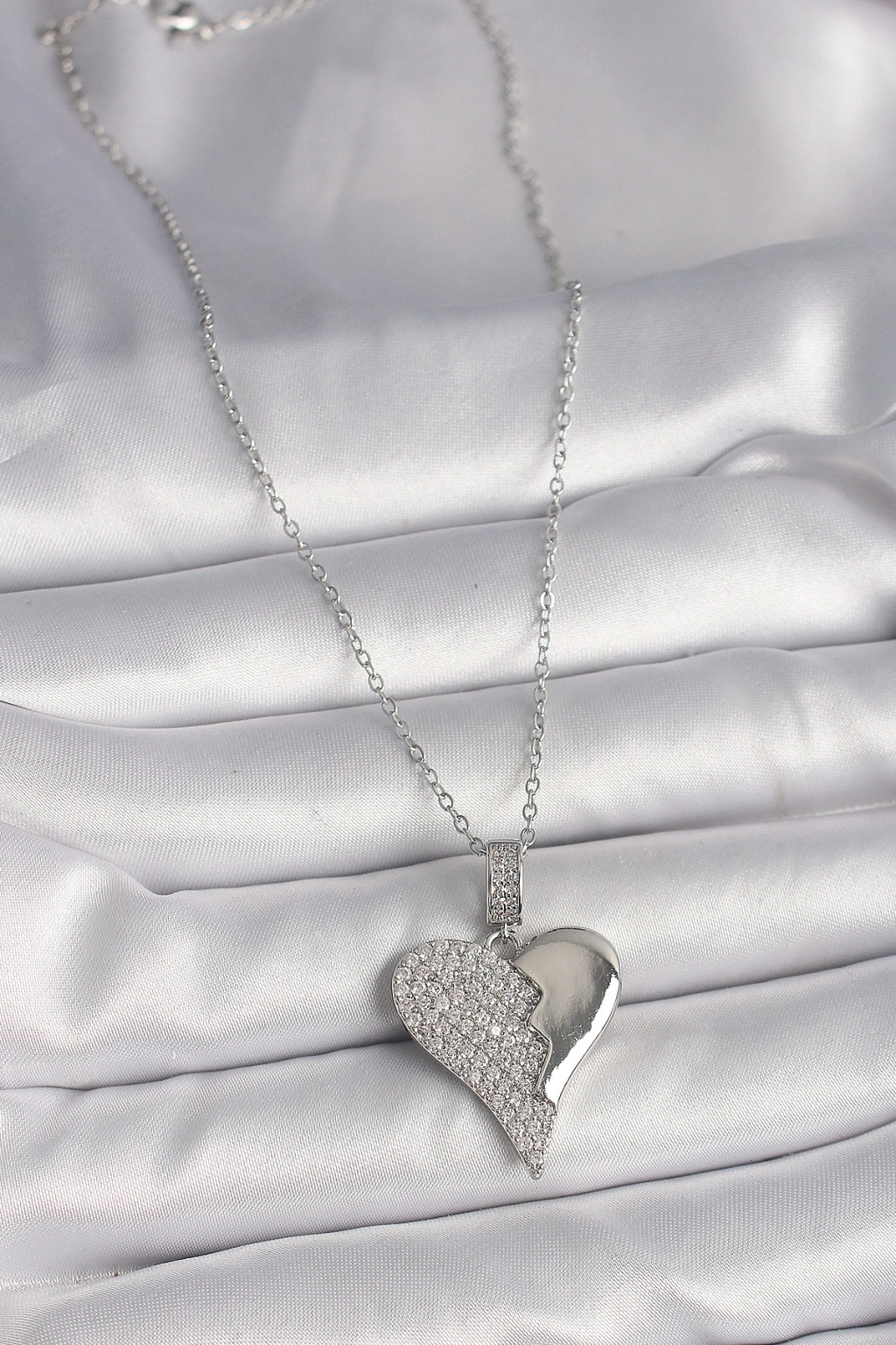 Erb 316L Çelik Gümüş Renk Zincir Zirkon Taşlı Kırık Kalp Model Kadın Kolye