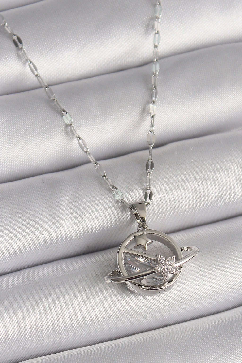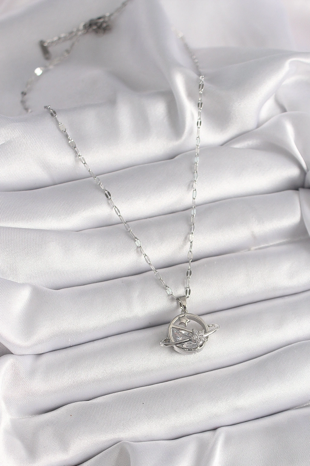 Erb 316L Çelik Gümüş Renk Zincir Zirkon Taşlı Yıldız Detay Gezegen Model Kadın Kolye