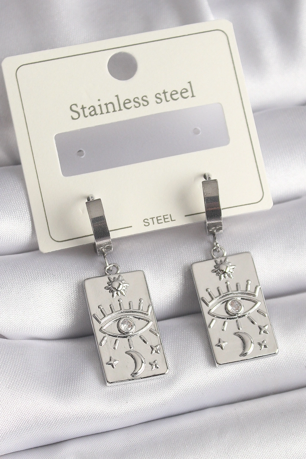 Erb 316L Çelik Gümüş Renk Zirkon Taşlı Göz İşleme Detaylı Plaka Model Kadın Küpe