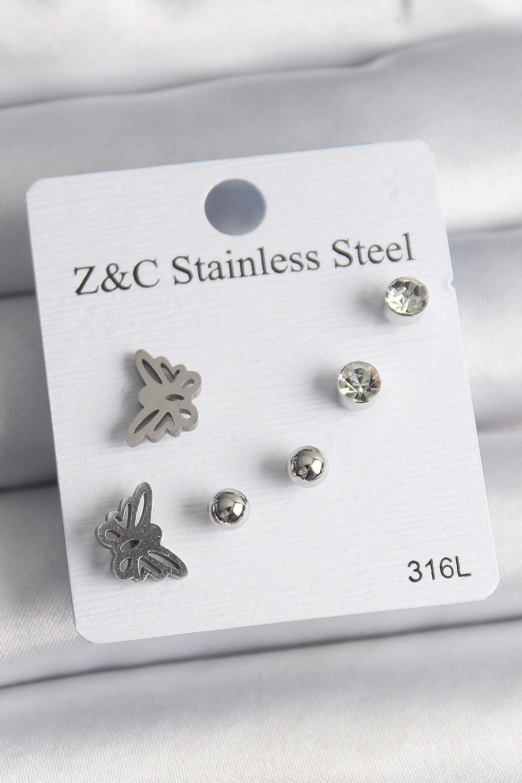 Erb 316L Çelik Gümüş Renk Zirkon Taşlı Kelebek Model Kadın Küpe Seti